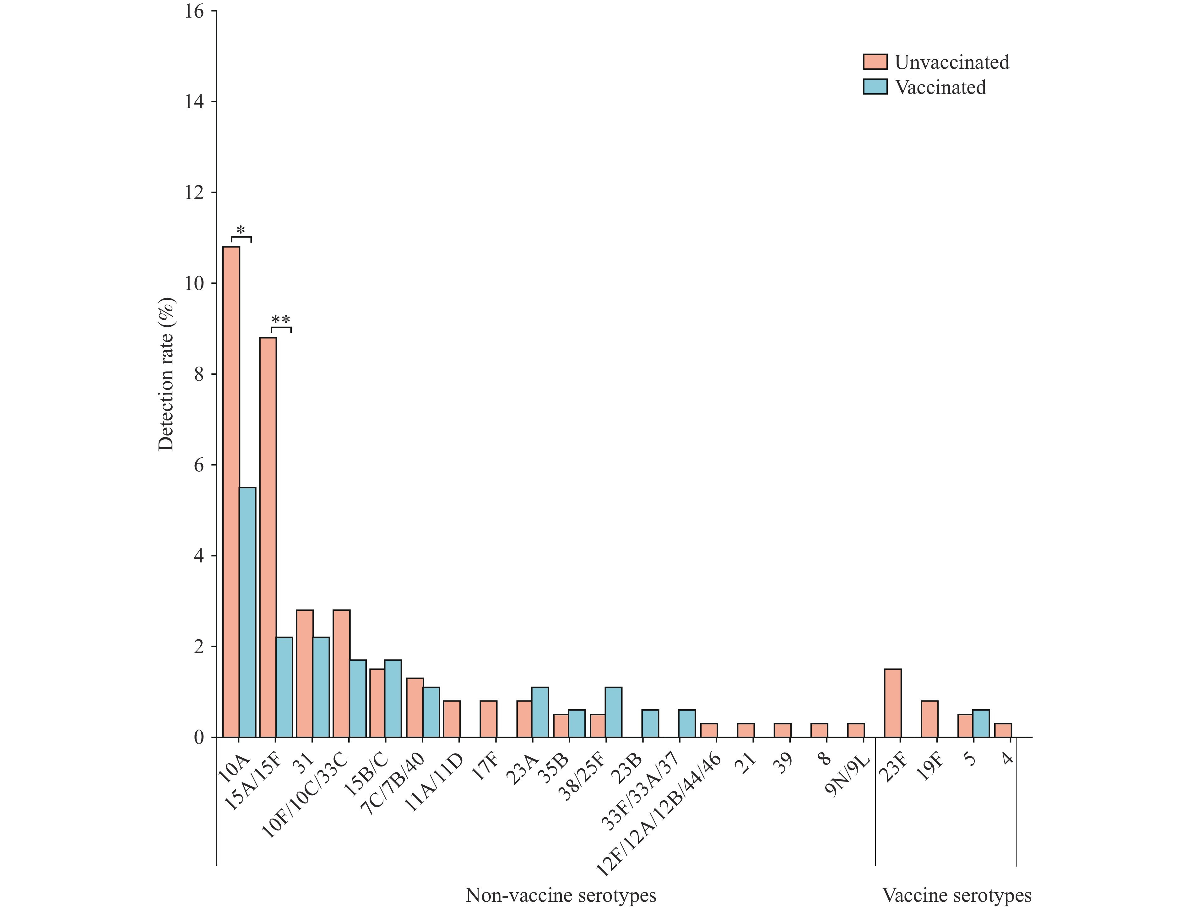 This study demonstrated that PCV13 vaccination significantly reduced the pharyngeal detection of S. pneumoniae among children with acute respiratory infections, with three to four doses decreasing the detection rate by 30.2%. This reduction encompassed both vaccine and non-vaccine serotypes. Additionally, non-PCV13 serotypes, particularly 10A and 15A/15F, were predominant in positive samples, underscoring the current dominance of non-vaccine serotypes in the study population.
