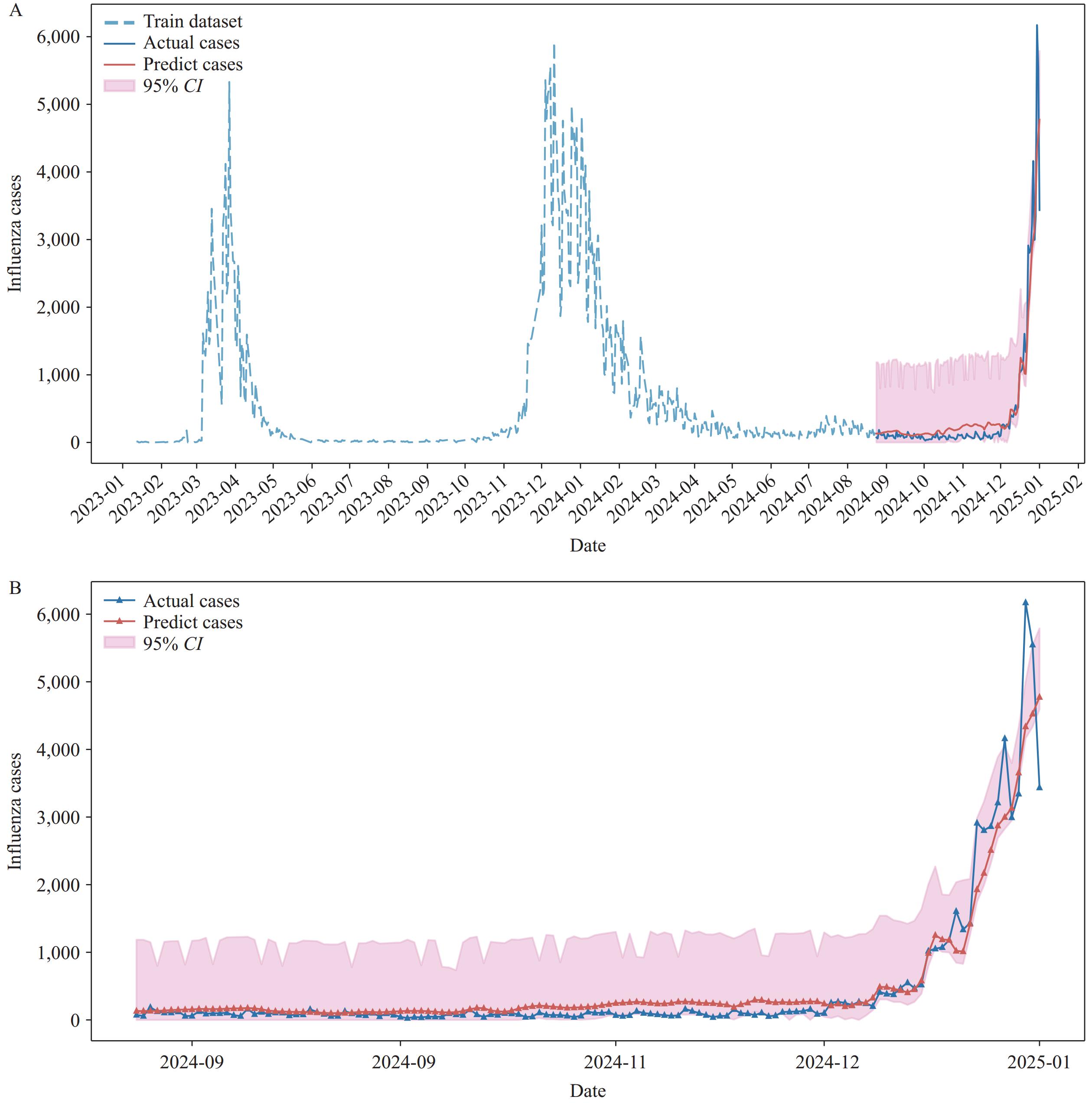 Data were collected from multichannel surveillance systems, including hospitals, search engines, and climatological and air pollutant surveillance systems, in a southern Chinese city from January 2023 to January 2025. Spearman’s correlation analysis assessed the relationships between variables and reported influenza cases. Several machine learning models were used to predict trends in reported cases.