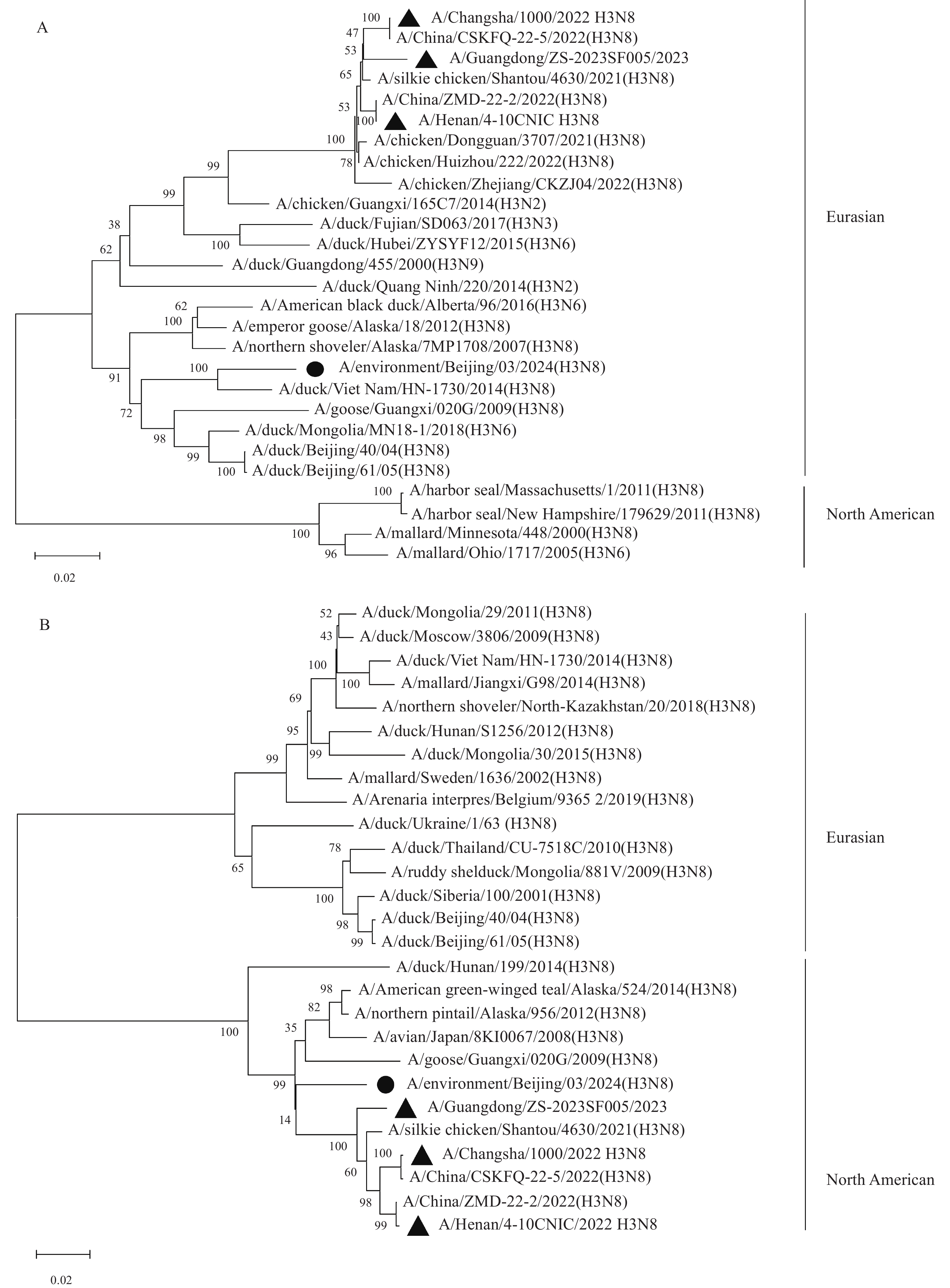 This study reports the isolation of a genetically reassorted, low-pathogenicity H3N8 avian influenza virus (AIV) from an islet in Niukouyu Wetland Park, Beijing Municipality — the first detection of this viral strain in a wild environment within the city. Throat swabs collected from park staff tested negative for influenza viruses. Phylogenetic analysis demonstrated that the viral hemagglutinin gene originated from the Eurasian lineage, while the neuraminidase gene was derived from the North American lineage. Although no direct evidence of human infection has been documented, multiple mutations identified in the virus’s internal genes are associated with enhanced replication capacity, increased virulence, and improved adaptation to mammalian hosts. These molecular features indicate a potential risk for cross-species transmission to humans.