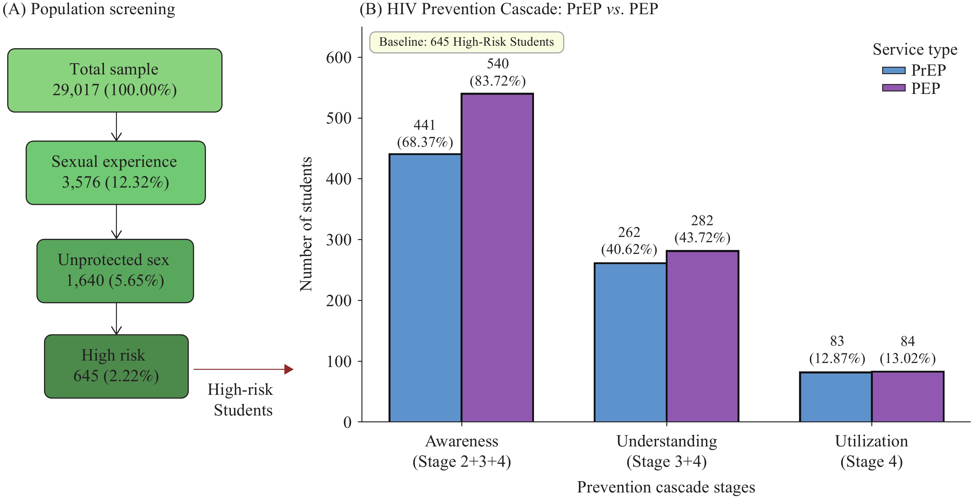 Chinese university students face elevated human immunodeficiency virus (HIV) risks, yet pre-exposure prophylaxis (PrEP) and post-exposure prophylaxis (PEP) uptake remain low despite proven efficacy.
