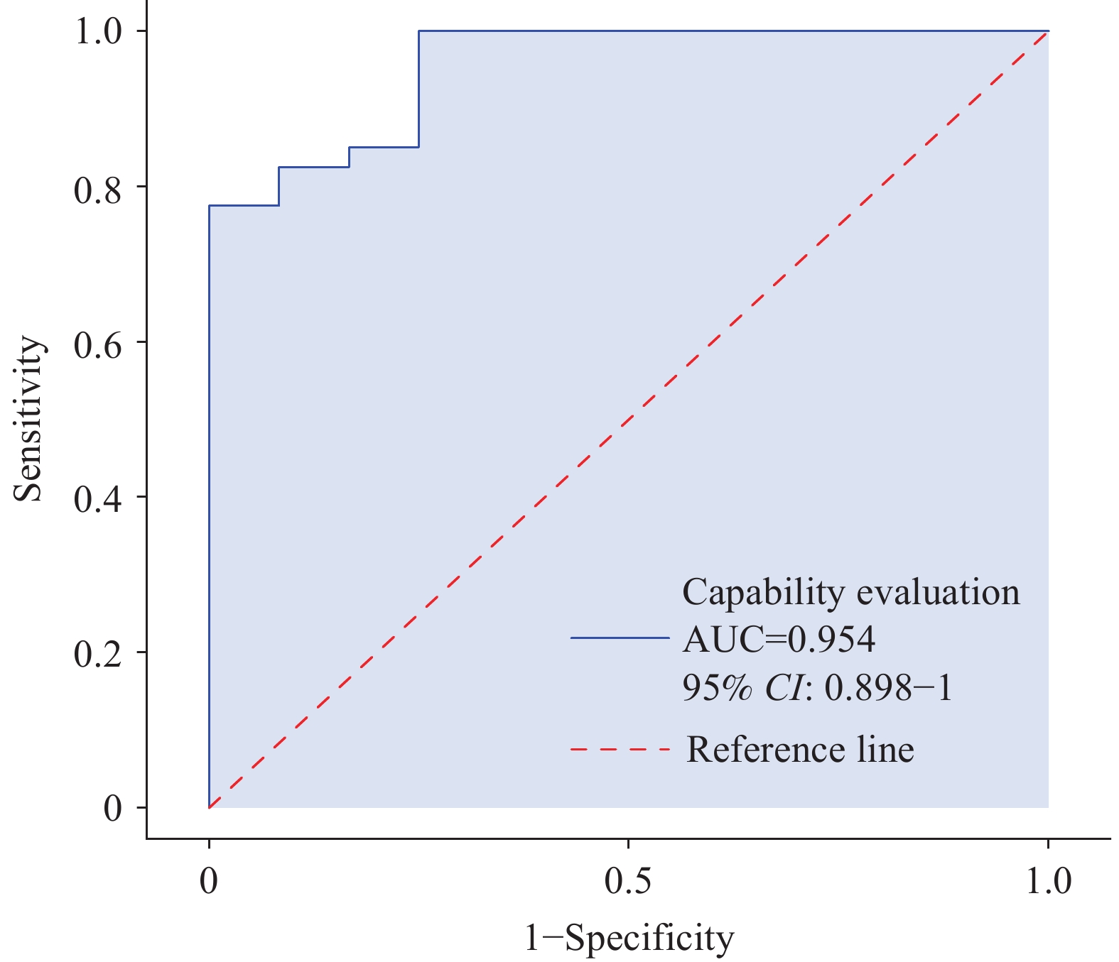 The scoring rates for management systems, material reserves, personnel capability, and quality control were 93.75%, 90.45%, 75.08%, and 51.97%, respectively. ODSP with a history of failed on-site disinfection efficacy evaluations scored significantly lower in personnel capability and quality control than those with consistently passing evaluations (P<0.01). The area under the ROC curve (AUC) for the assessment indicators was 0.954 [95% confidence interval (CI): 0.898, 1], with an optimal capability score threshold of 70 points. The Kappa coefficient was 0.822.