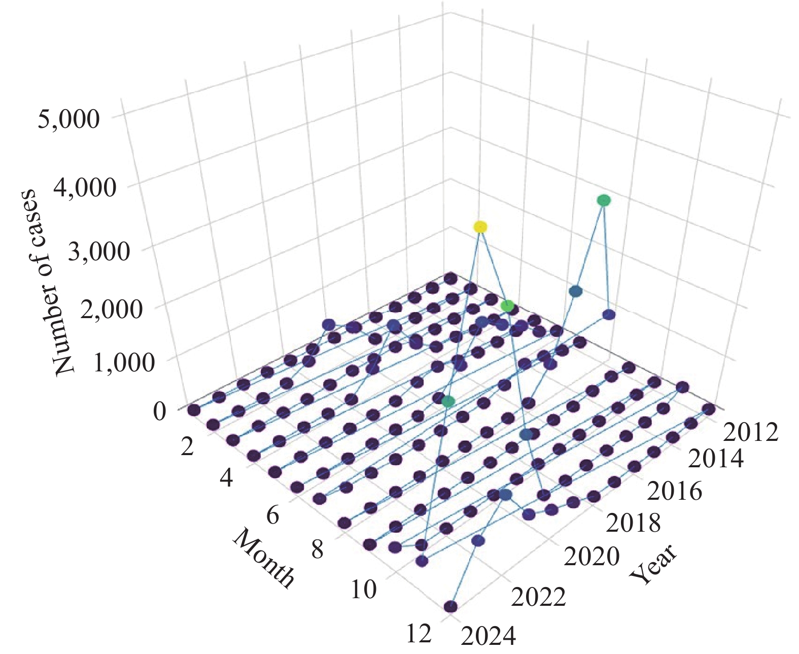 From 2012–2024, dengue fever in Yunnan Province showed seasonal peaks and significant spatial and spatiotemporal clusters, particularly in border prefectures. Temperature and precipitation were key drivers of dengue incidence.
