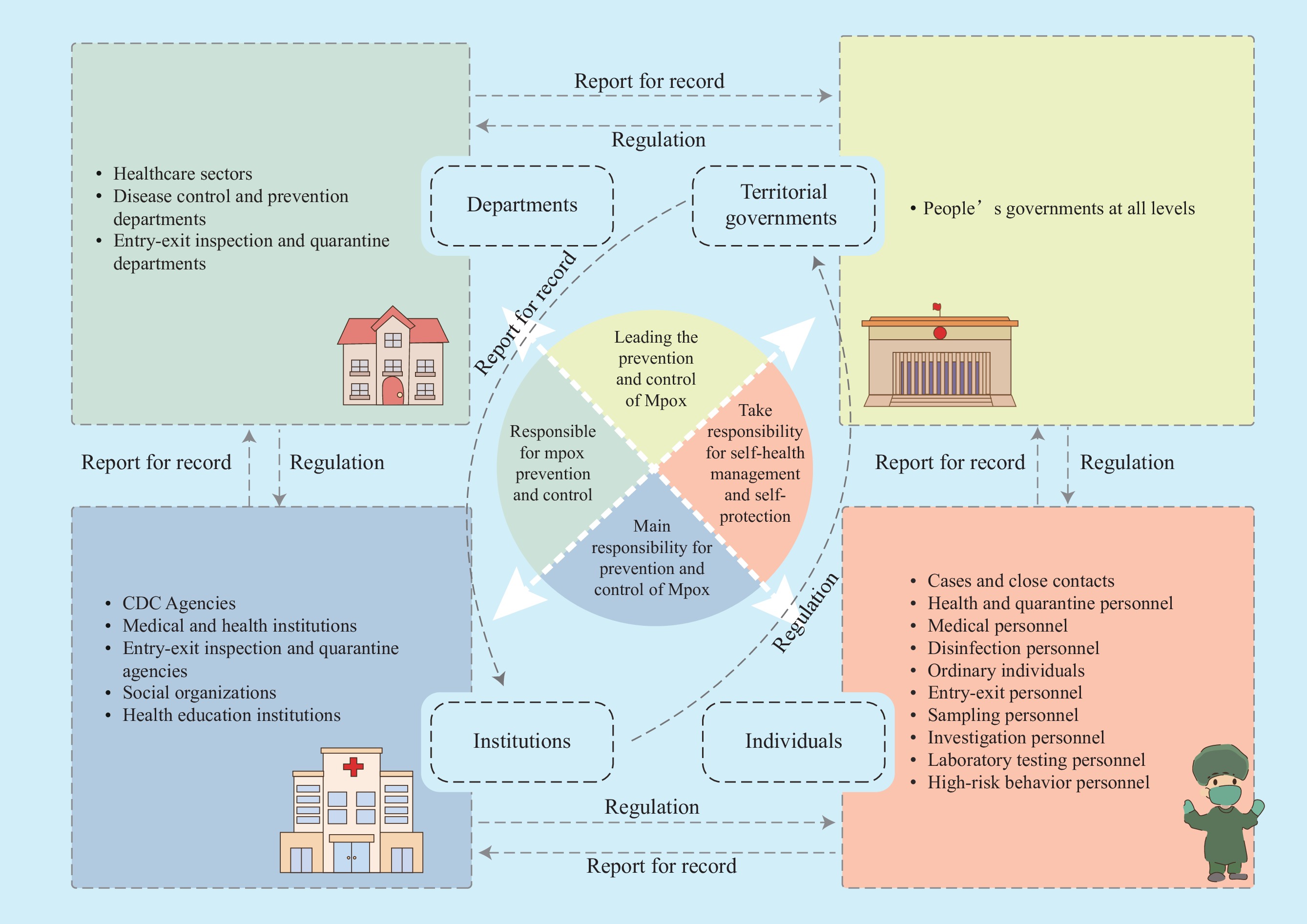 In 2023, the emergence of the mpox virus (MPXV) subclade Ⅰb in the Democratic Republic of the Congo triggered a new wave of mpox outbreaks that subsequently spread to other African countries and beyond. Policies provide the framework for mpox epidemic prevention and control in China, requiring systematic analysis of policy evolution and content characteristics. This study employs policy tool theory to construct a three-dimensional analytical framework encompassing policy instruments (X), policy objects (Y), and policy measures (Z), and utilizes content analysis methodology to evaluate China’s national regulatory mpox prevention and control policies. The results demonstrate that China’s national-level mpox prevention and control policies are in substantial agreement with the World Health Organization (WHO) core recommendations, with distinct emphases on the application of policy instruments, policy objects and policy measures, the prioritization of comprehensive epidemic response capabilities, and aligning with both domestic and international mpox epidemic conditions and national prevention strategies. Moving forward, China should further enhance its mpox prevention and control system resilience by optimizing vaccine strategies and expanding social mobilization initiatives.