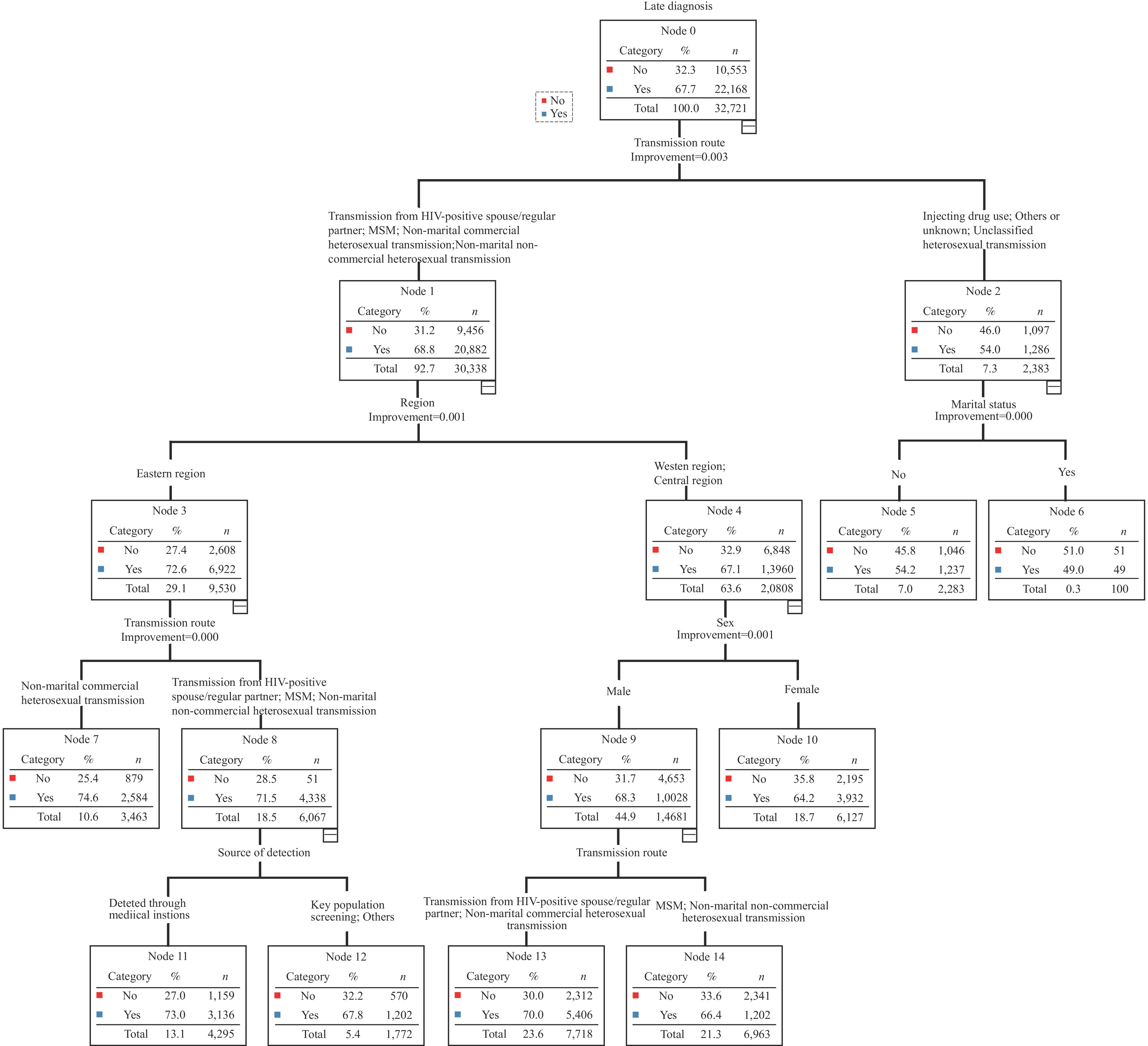 Using nationwide surveillance data spanning 2022–2024 and employing two complementary analytical approaches, this study identified transmission route and geographic region as primary correlates of late HIV diagnosis. Decision-tree analysis further identified two distinct subgroups in eastern China exhibiting particularly elevated proportions of late diagnosis.