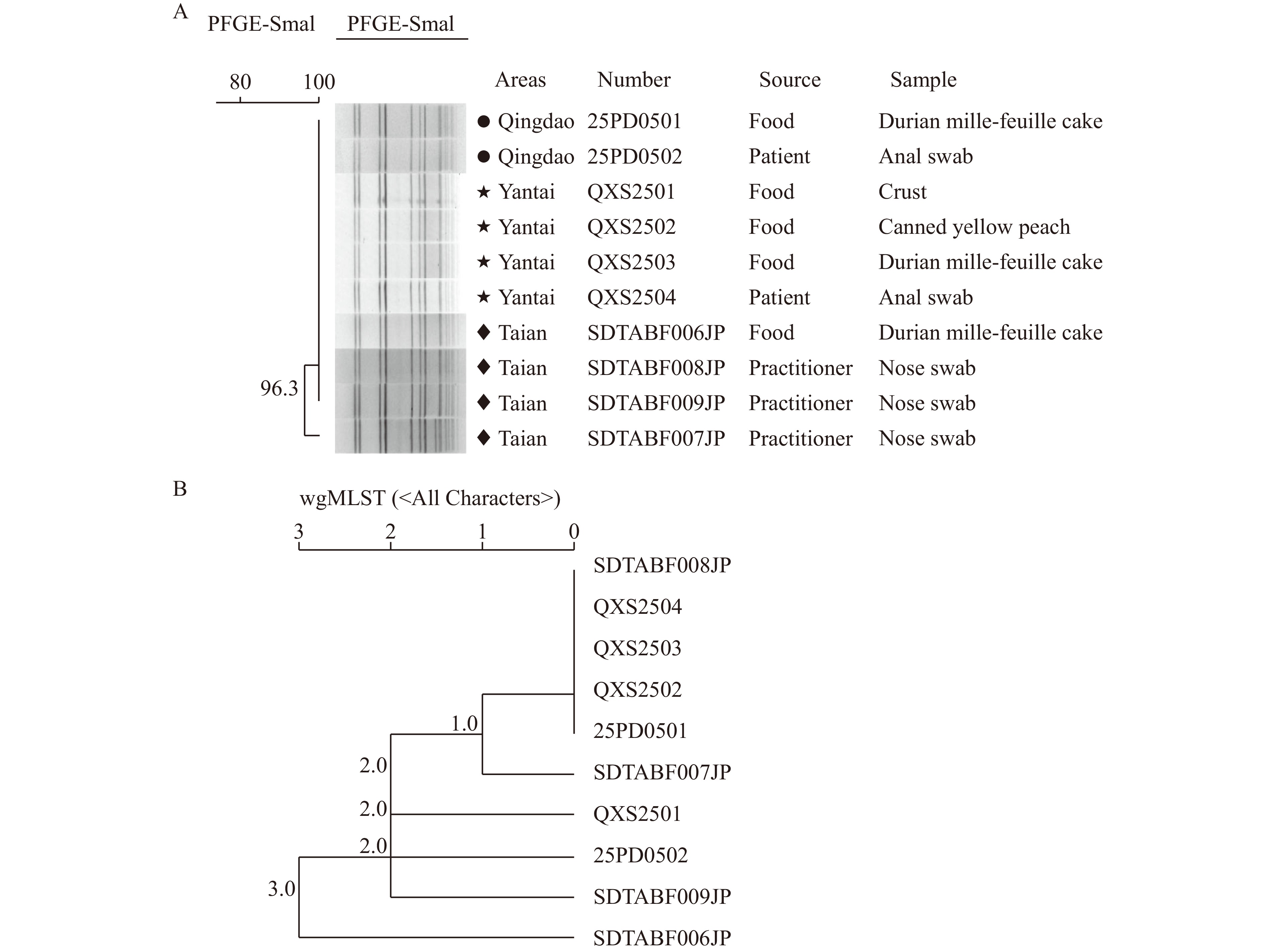 Investigation identified 22 cases aged 9–61 years. All patients experienced diarrhea. Durian mille-feuille cakes were identified as the suspected food vehicle. cgMLST analysis demonstrated that clinical isolates, food samples, and food handler isolates exhibited minimal genetic divergence.