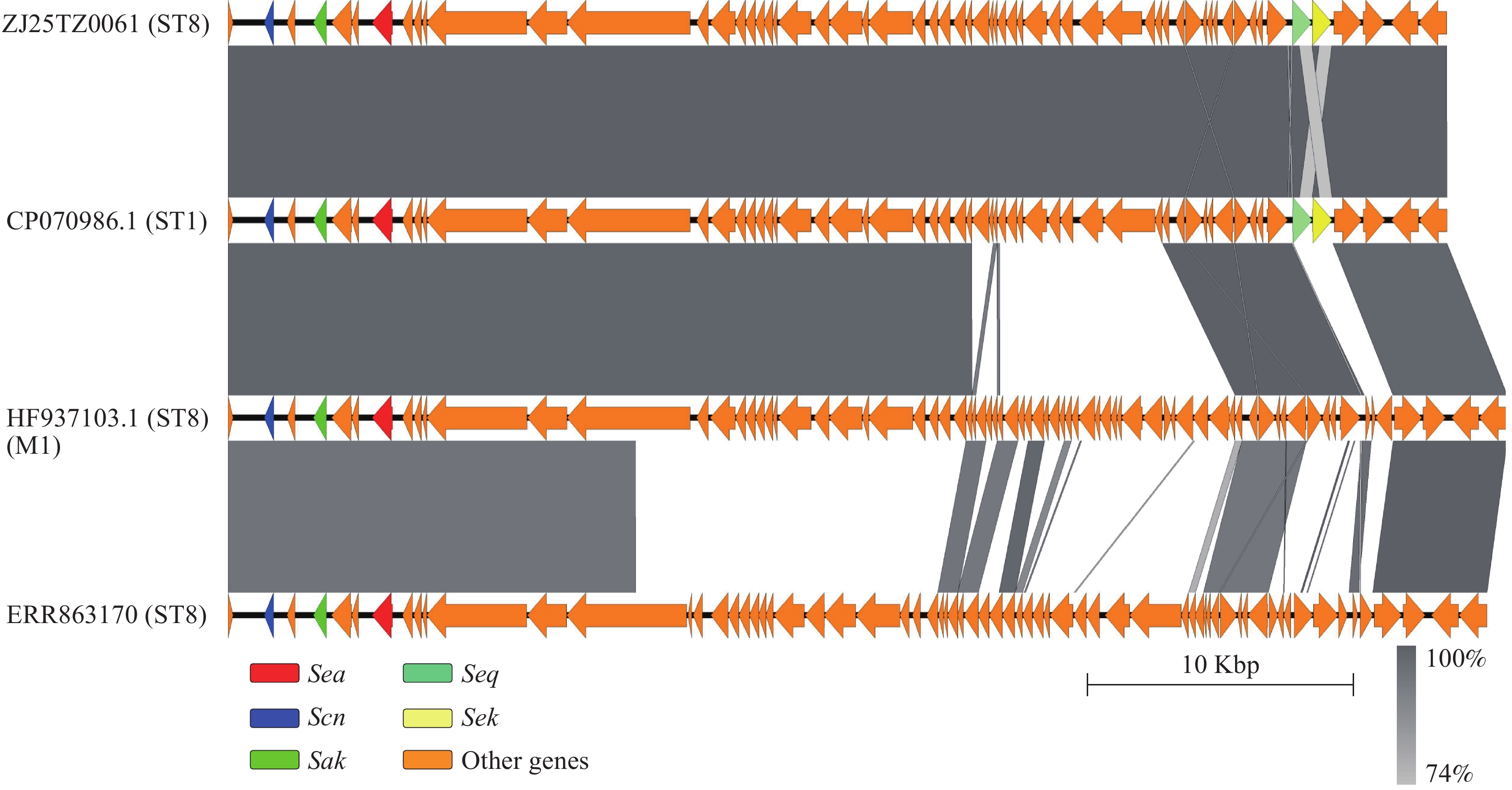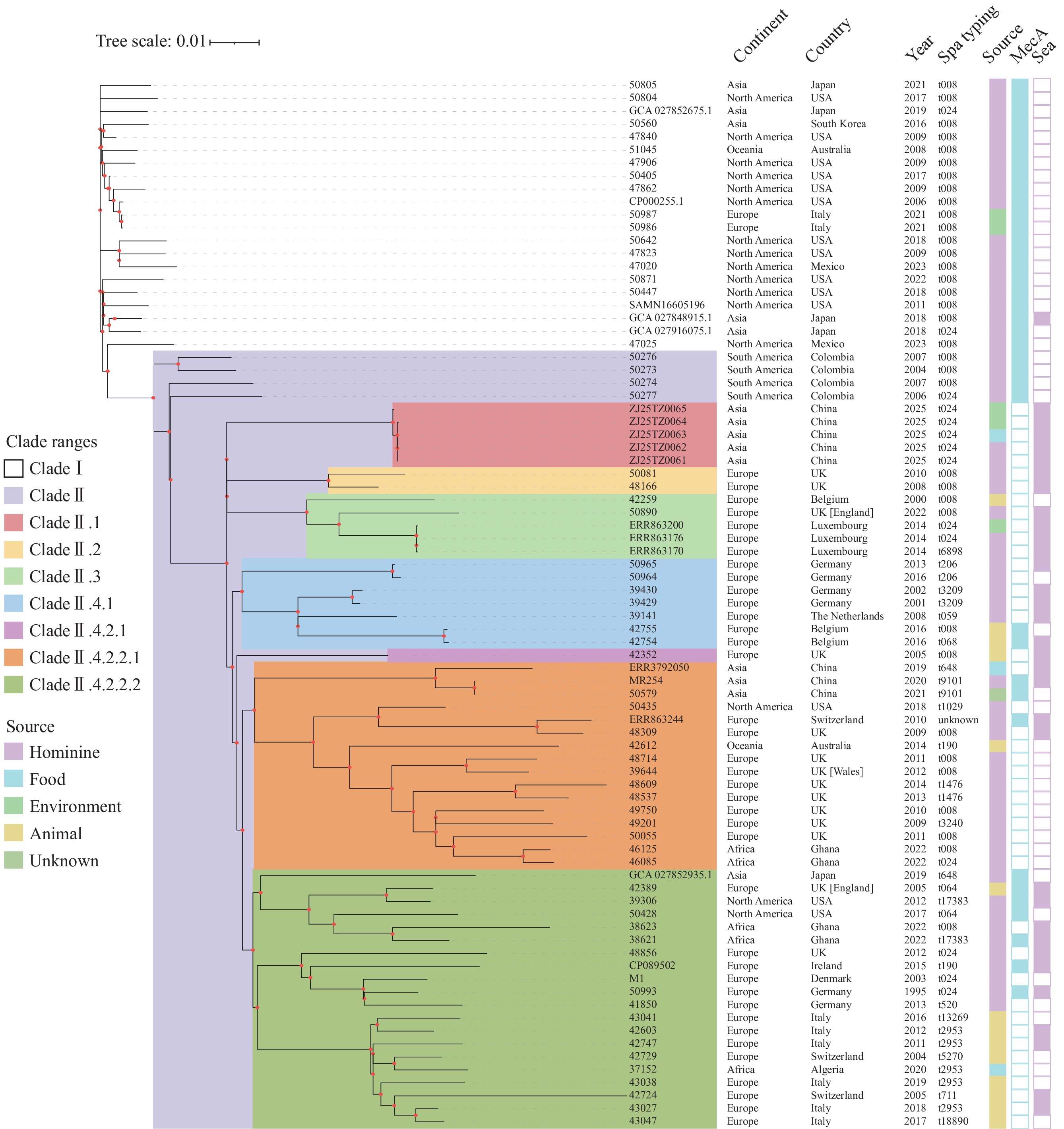 This report documents the first staphylococcal food poisoning outbreak in Zhejiang Province, China, caused by methicillin-susceptible S. aureus (MSSA) of the ST8 (CC8)-spa t024 lineage harboring enterotoxin genes sea, seq, and sek. Whole-genome phylogenetic analysis revealed that the outbreak strains belonged to a distinct evolutionary subclade (Clade II.1). These strains demonstrated close genetic relatedness to previously reported European lineages.
