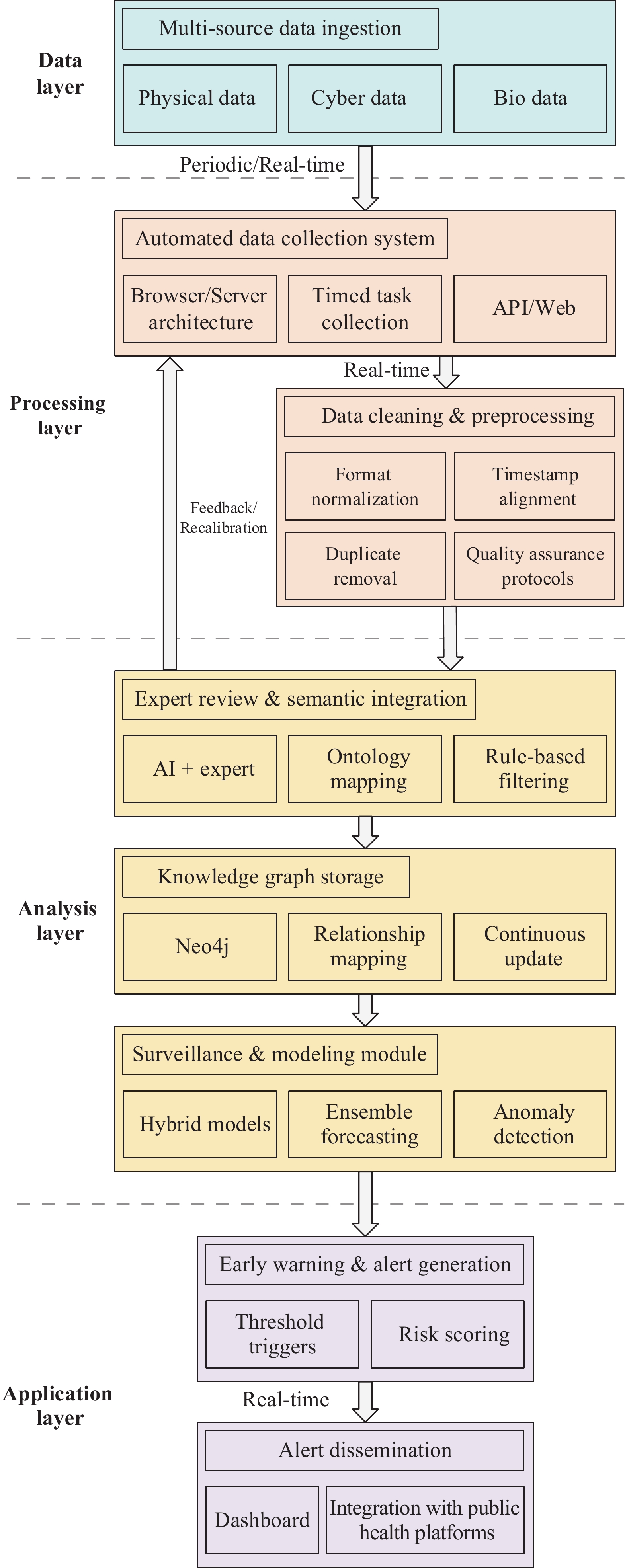 This system integrates heterogeneous signals, including official epidemiology, digital traces, mobility, meteorology, and pathogen genomics, using semantic harmonization and a hybrid analytic stack. Seasonality-adjusted baselines with anomaly detection, mobility- and climate-aware SEIR models, and short-horizon learners generated calibrated early-warning scores. Thresholds were constrained by positive predictive value. Pilot studies were conducted for coronavirus disease 2019 (COVID-19) in Yantai and severe fever with thrombocytopenia syndrome virus (SFTSV) in Shandong and Henan, with tuberculosis indicators embedded for programmatic use.