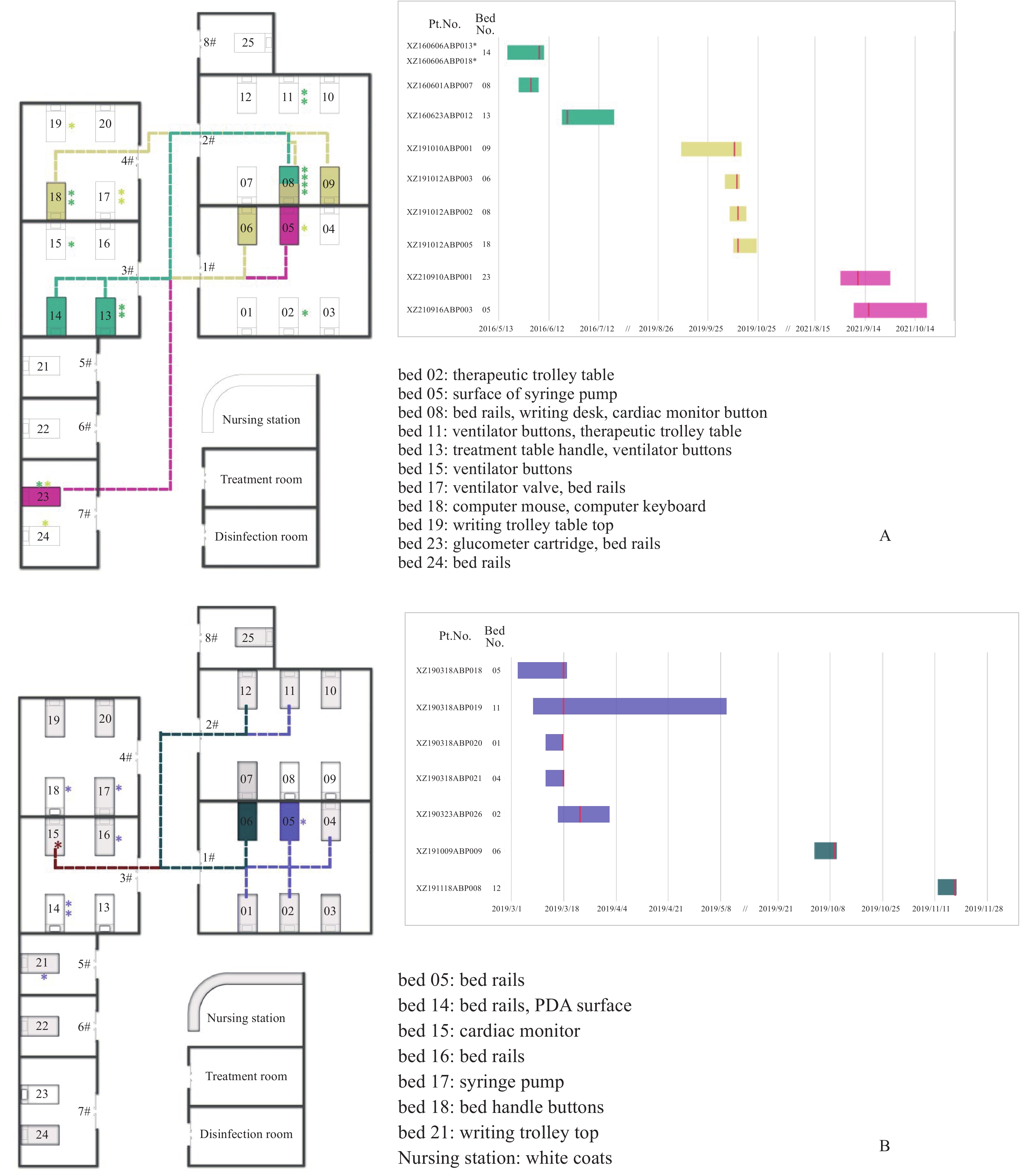 This retrospective study analyzed five separate CRAB nosocomial infection clusters that occurred in 2016, 2019, and 2021. This revealed the molecular epidemiological links between cases and environmental samples across different years, suggesting the potential for ongoing environmental transmission. Following intensive terminal disinfection, no homologous pathogens have been detected since 2021.