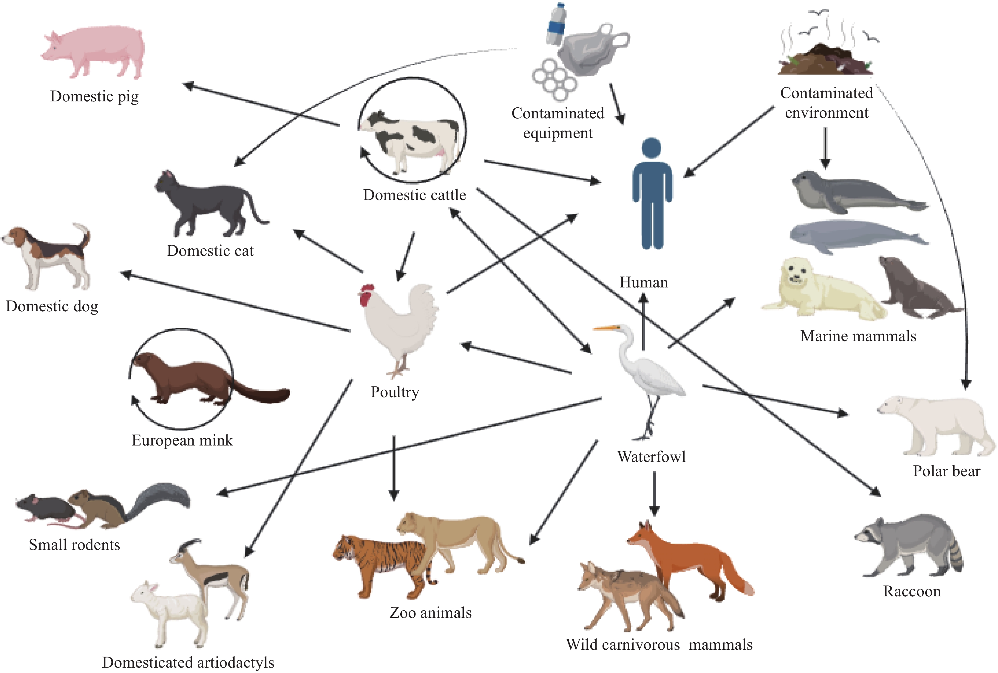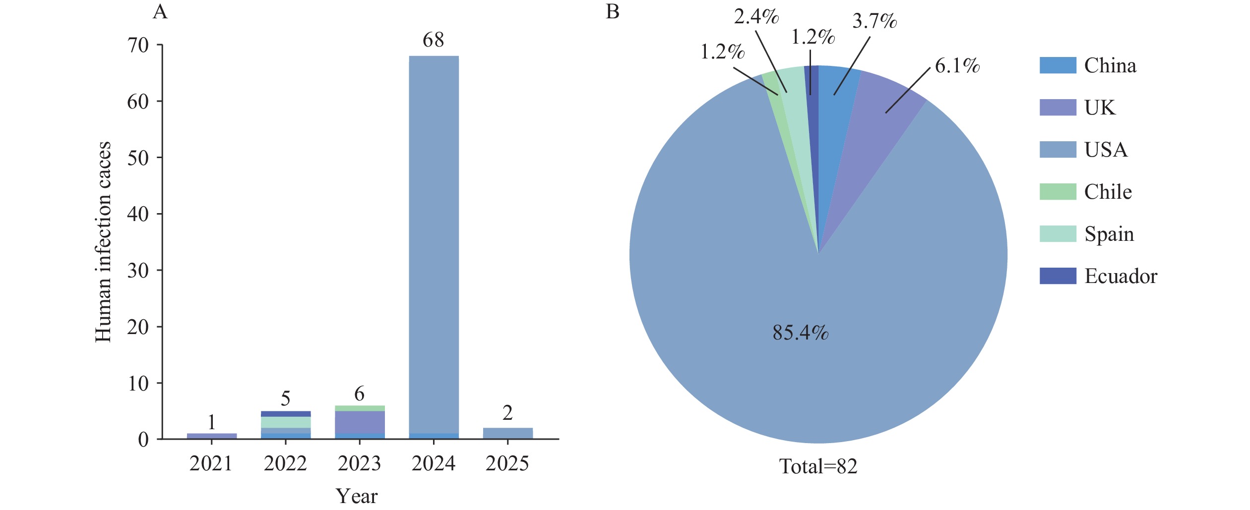 Since late 2020, clade 2.3.4.4b H5N1 highly pathogenic avian influenza viruses (HPAIVs) have expanded globally, infecting wild birds, poultry, and an increasing range of mammals. Sustained transmission has occurred in minks and dairy cattle, accompanied by key polymerase basic 2 (PB2) mutations (e.g., E627K, D701N), signaling mammalian adaptation and heightened zoonotic risk. From 2021 to early 2025, 82 human cases, including fatalities in China and the US, underscored rising public health concerns, although no sustained human-to-human transmission has been detected. This review summarizes the epidemiology, transmission dynamics, and molecular evolution of clade 2.3.4.4b H5N1 in mammals. Large-scale outbreaks in US dairy cattle and associated human cases highlight significant cross-species risks, while China’s high poultry vaccination coverage, rapid culling, and nationwide surveillance demonstrate the value of proactive prevention. These contrasting experiences emphasize the need for targeted surveillance, reinforced biosecurity, accelerated countermeasure development, and global coordination under the One Health framework.