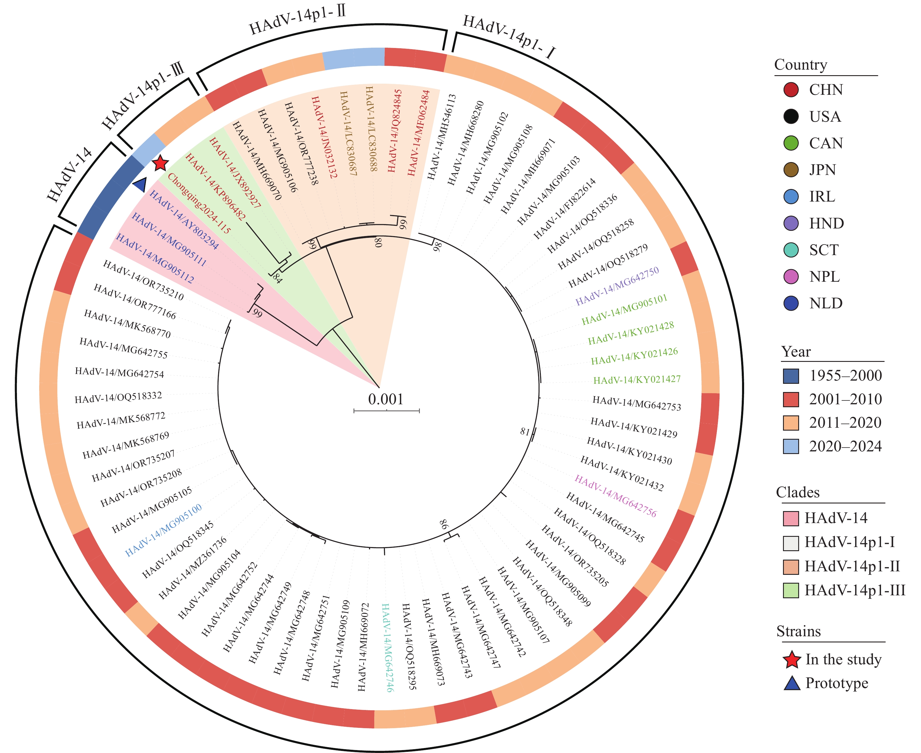 Whole-genome sequencing was performed on the HAdV-14 strain Chongqing2024-115, followed by comprehensive phylogenetic and genetic variation analyses using all publicly available global HAdV-14 genome sequences from the GenBank database.