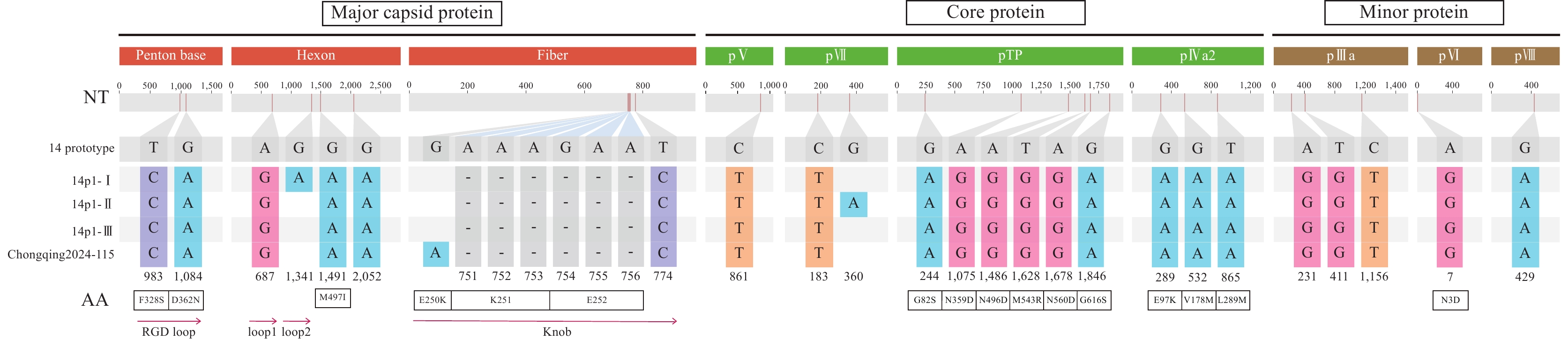 Genome-based phylogenetic analysis classified global HAdV-14 strains into two well-supported clades: the HAdV-14 prototype clade and the variant HAdV-14p1 clade. The latter was further subdivided into three distinct subclades (I–III). Chongqing2024-115 clustered closely with earlier HAdV-14p1 subclade III and isolates from Beijing (2012) and Gansu (2013), showing high sequence identity (99.7%–99.9%). Compared with the genome of the HAdV-14 prototype strain (de Wit, AY803294), all three HAdV-14p1 subclades shared 99 specific nucleotide variations, including a six-nucleotide deletion in the knob domain of the fiber gene (nt751–756). The identification of subclade-specific variations and mutations unique to strain Chongqing2024-115 indicates ongoing microevolution within the HAdV-14p1 clade.