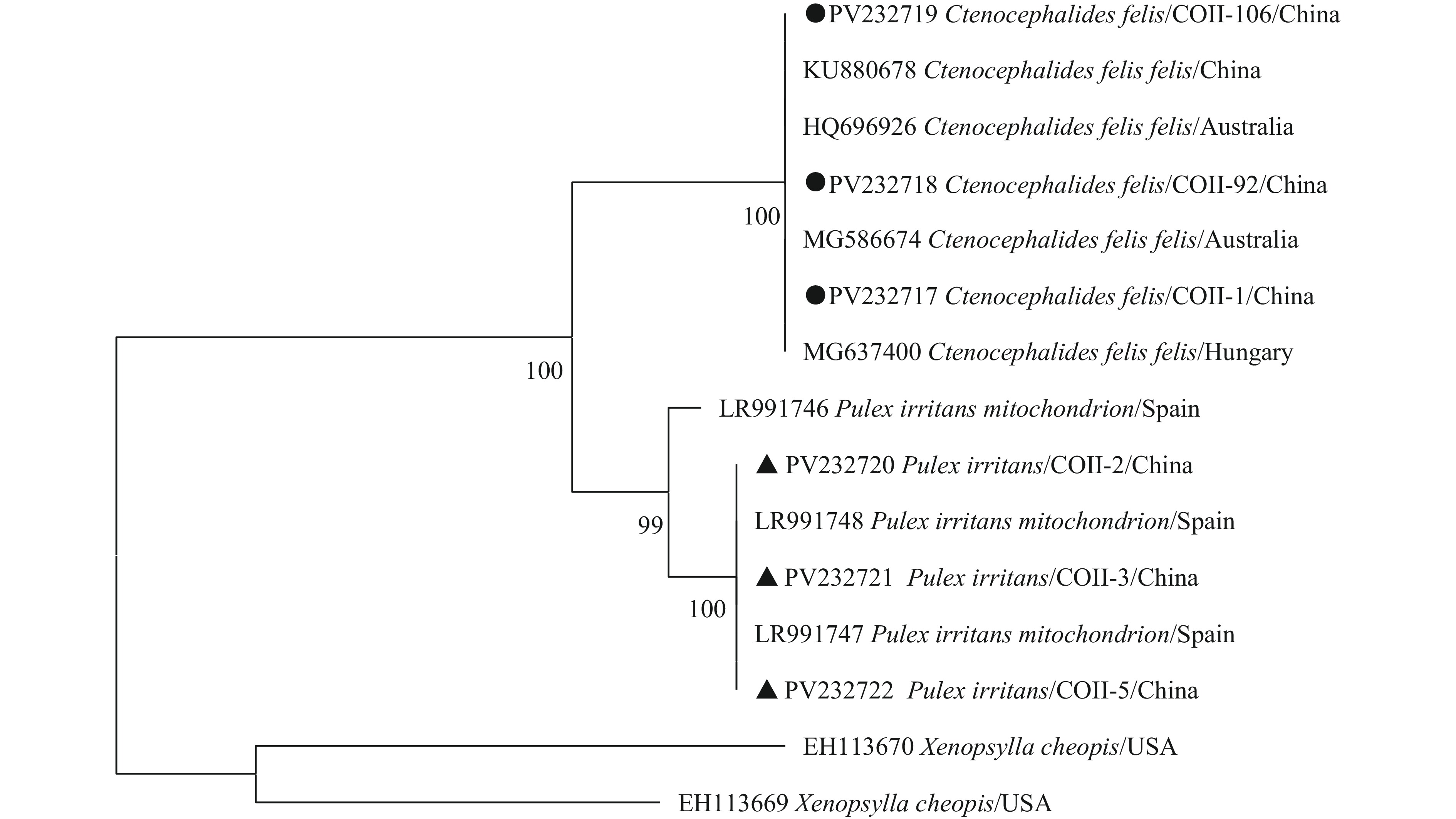 The 121 collected fleas were disinfected by soaking in sodium hypochlorite bleach for 30 seconds, followed by immersion in 75% alcohol for 10 minutes, washed twice, and rinsed with ultra-pure water. Each flea was placed in a 1.5 mL grinding tube and homogenized using a high-throughput grinder. Morphological characteristics and CoII gene detection and sequencing identified 3 Ctenocephalides felis and 118 Pulex irritans. The sequence analysis of the flea CoII gene is shown in Figure 1.