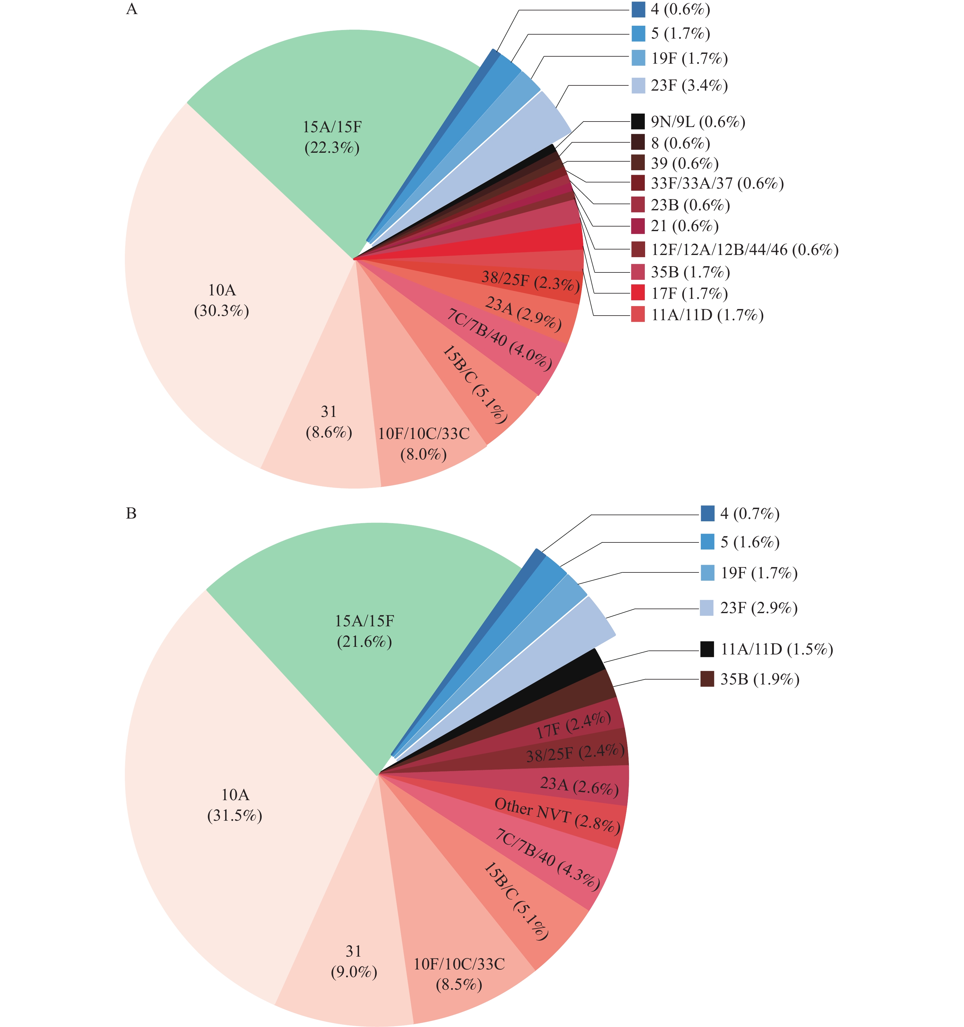 Note: In panels A and B, the vaccine serotypes are highlighted in blue. Other NVT included 12F/12A/12B/44/46, 21, 23B, 33F/33A/37, 39, 8, and 9N/9L.