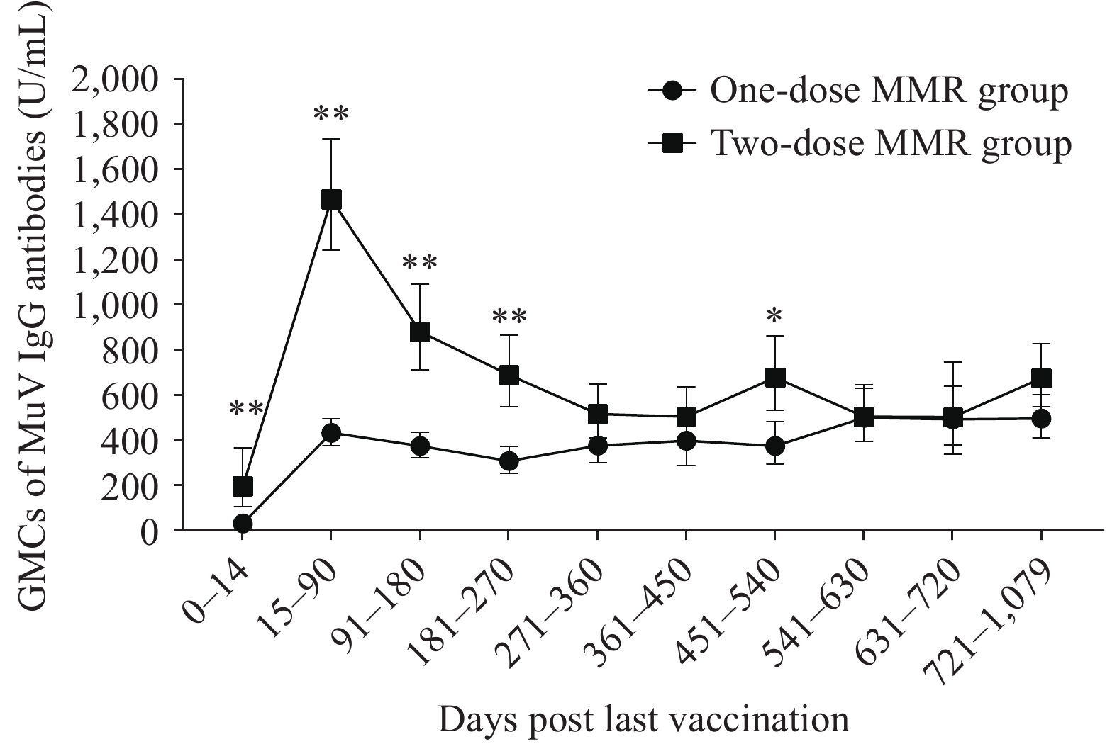 Note: The figure presents the GMCs of MuV IgG antibodies in populations that received two different MMR vaccination regimens, measured at multiple time points after vaccination. The dotted line represents the temporal changes in antibody levels among individuals in the one-dose MMR group, while the square-marked line shows the corresponding dynamics in the two-dose MMR group.