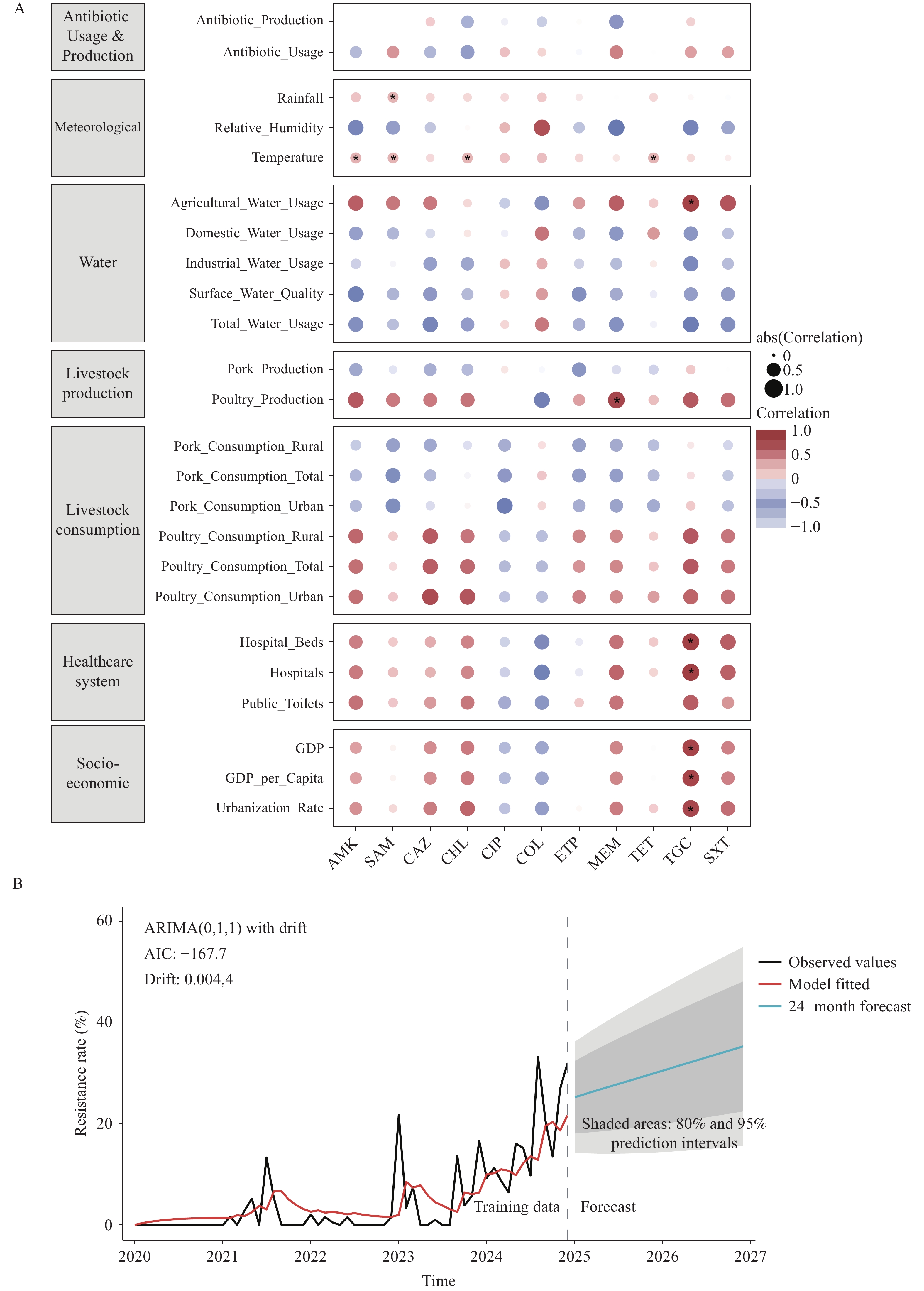 FIGURE 3.  Correlation between the resistance rates to 11 antibiotics and natural/socioeconomic factors, and forecasting of TGC resistance. (A) Spearman correlation matrix between potential influencing factors and antimicrobial resistance rates. (B) Time-series forecast for TGC resistance based on an ARIMA (0,1,1) model with drift.