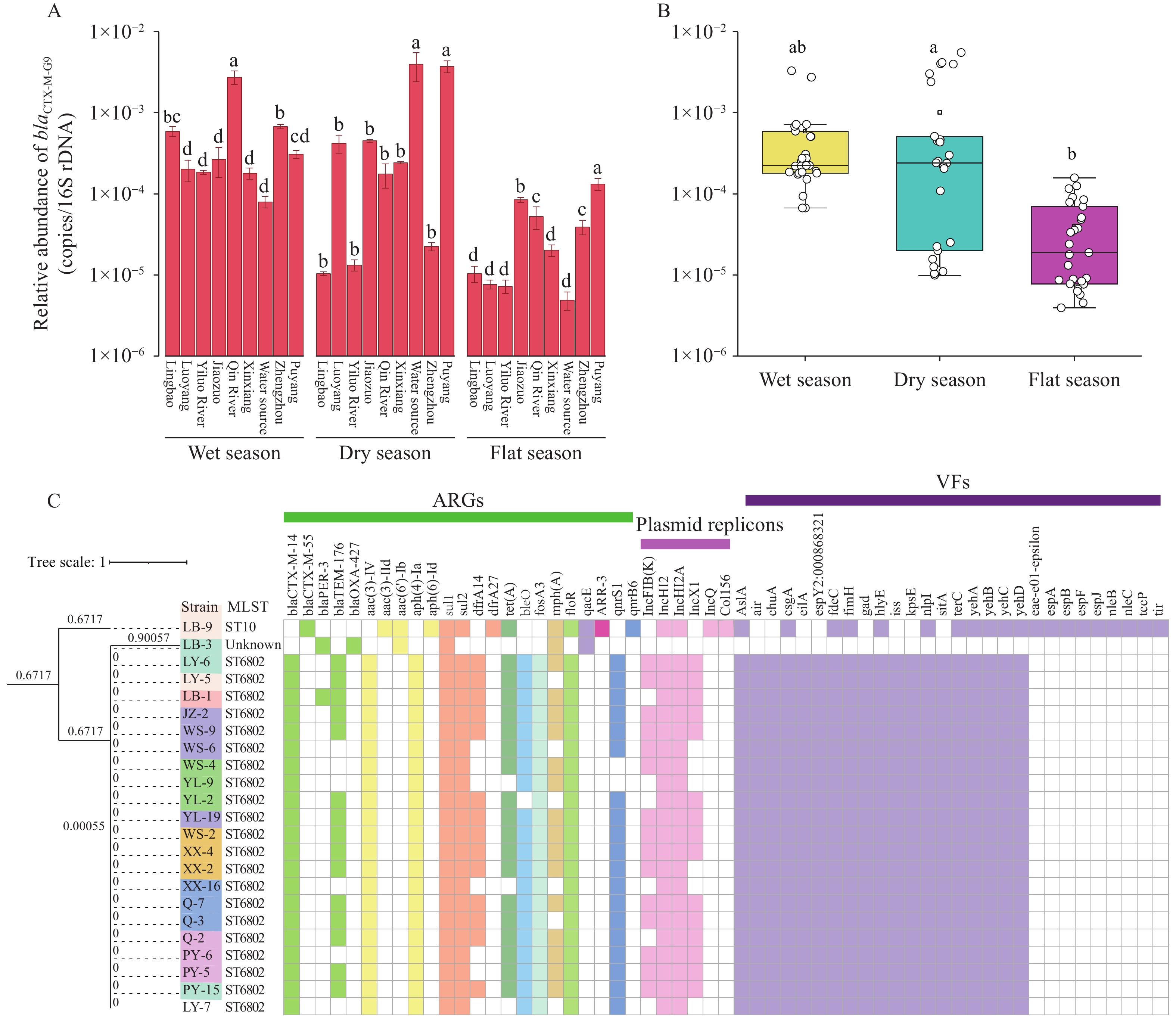 Prevalence of the blaCTX-M-G9 gene and CTX-M-producing E. coli in the Yellow River and associated source water. Relative abundance of blaCTX-M-G9 across different (A) cities and (B) seasons. (C) SNP-based phylogenetic tree of 23 CTX-M-producing E. coli isolates, displaying associated antibiotic resistance genes, virulence factors, and plasmid replicon types.