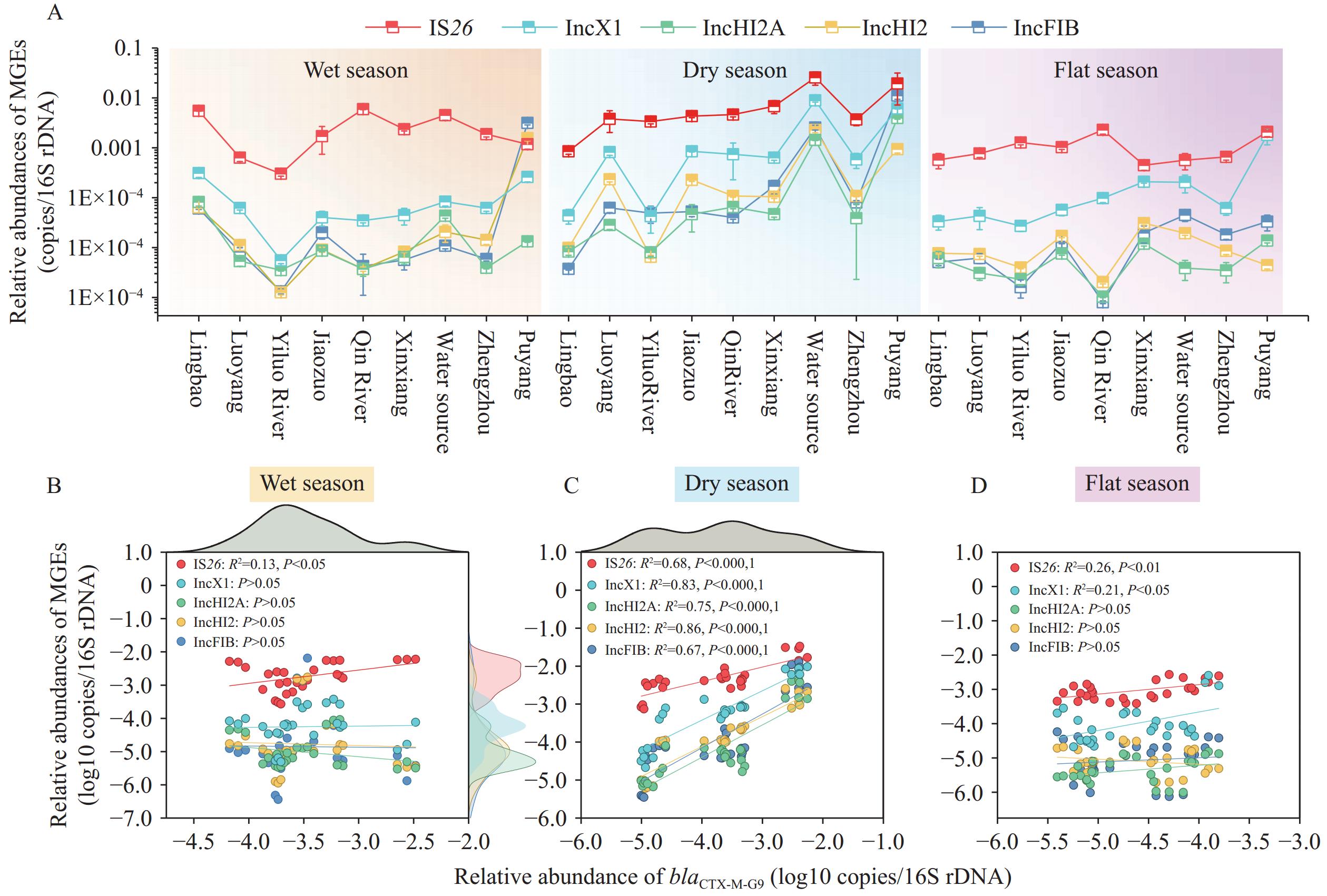Relative abundances of plasmids and IS26 carried by E. coli ST6802 in (A) the Yellow River and their correlations with blaCTX-M-G9 during the (B) wet, (C) dry, and (D) flat seasons.
