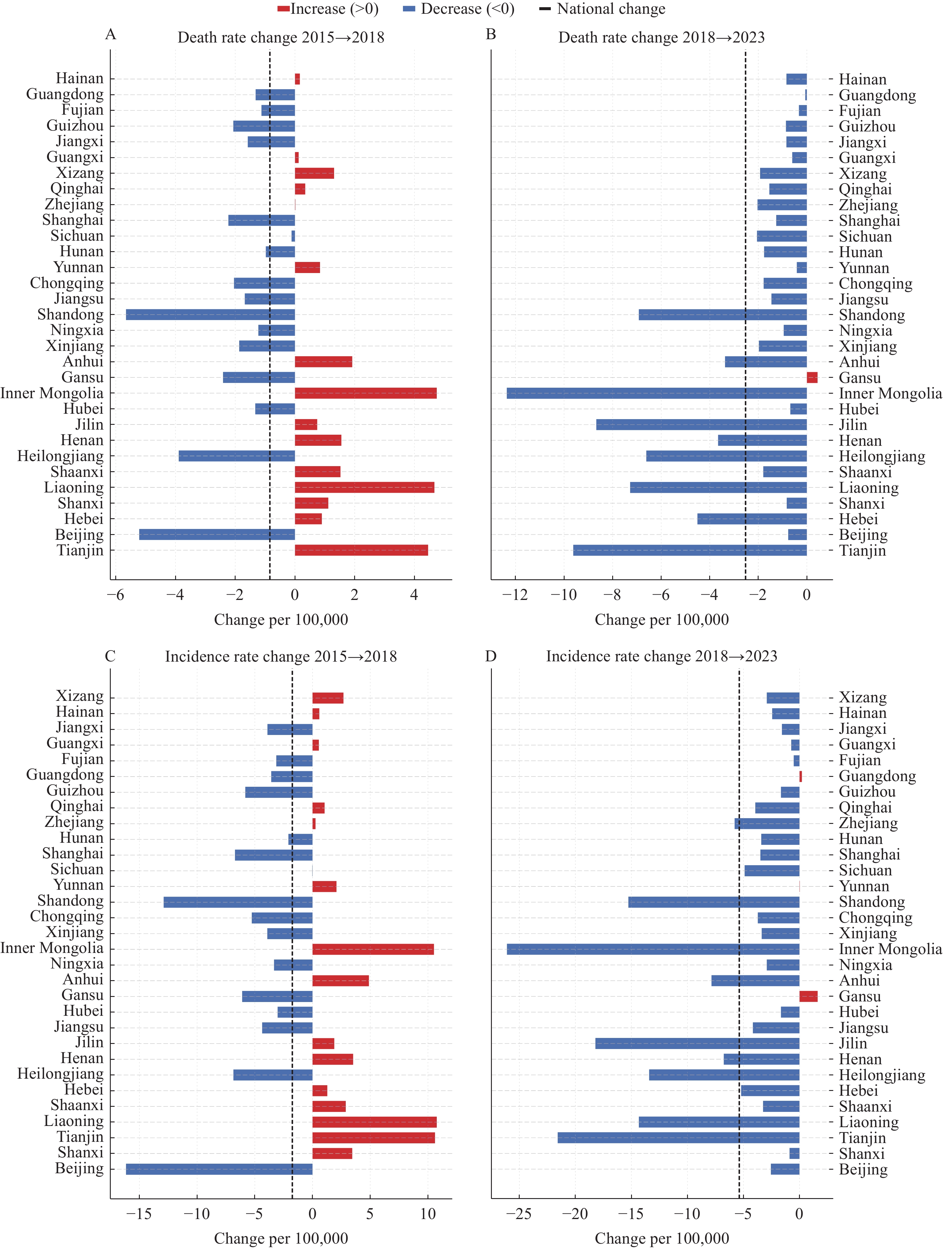 Figure 2.Province-level changes in CVD mortality and morbidity attributable to potentially inappropriate preventive medication use, China, 2015–2018 and 2018–2023. (A) Death rate change 2015−2018; (B) Death rate change 2018−2023; (C) Incidence rate change 2015−2018; (D) Incidence rate change 2018−2023.