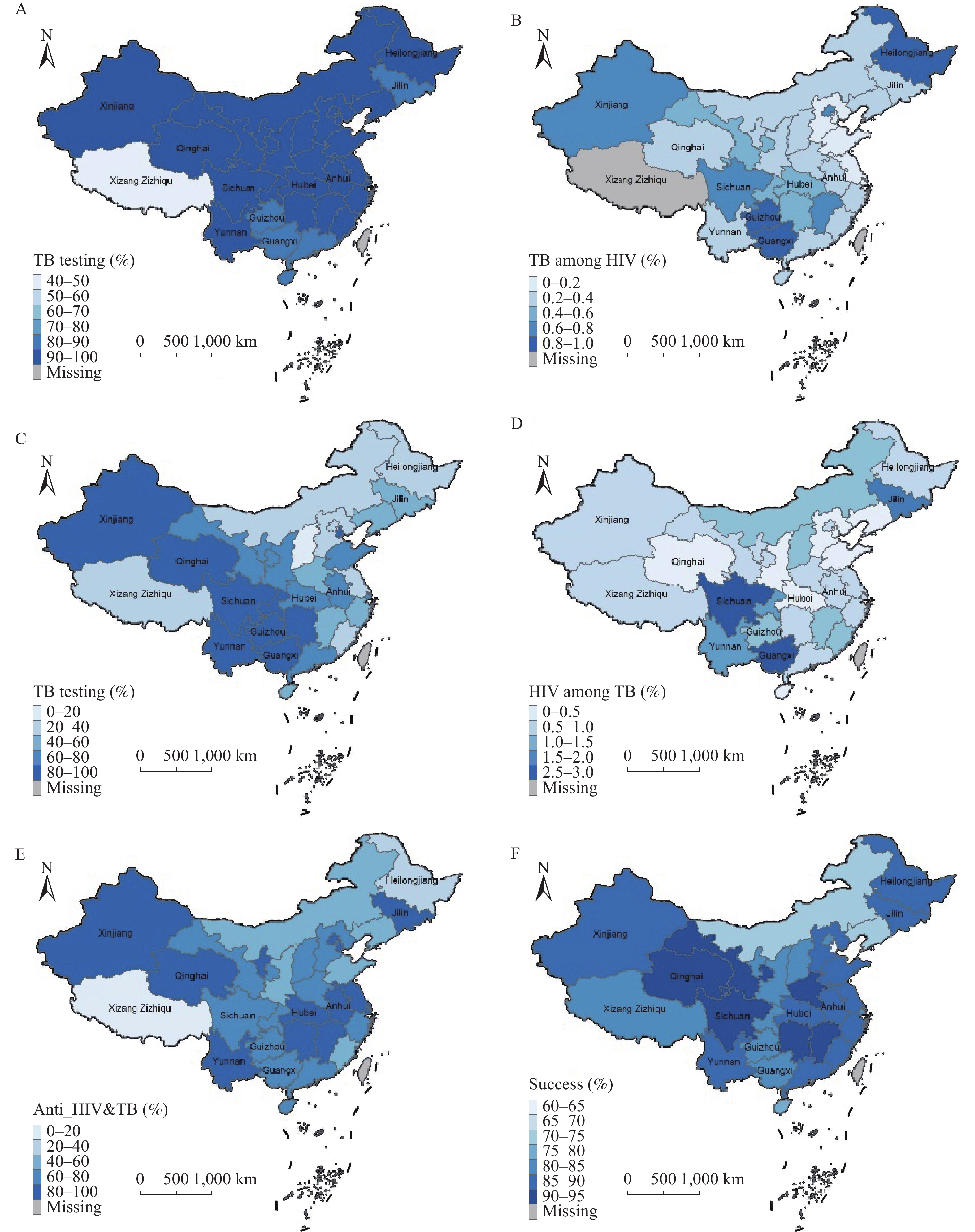 Figure 1.Regional Disparities in Bidirectional Screening and Treatment for TB/HIV Comorbidity in China, 2020–2024. (A) Proportion of tuberculosis examination among people living with HIV; (B) Tuberculosis prevalence among people living with HIV. Data from Tibet excluded from analysis due to extreme values; (C) Proportion of HIV testing among tuberculosis patients; (D) Prevalence of HIV/AIDS among tuberculosis patients; (E) Proportion of concurrent antiretroviral therapy and anti-TB treatment among notified TB/HIV patients; (F) Proportion of anti-TB treatment success among TB/HIV comorbid patients.