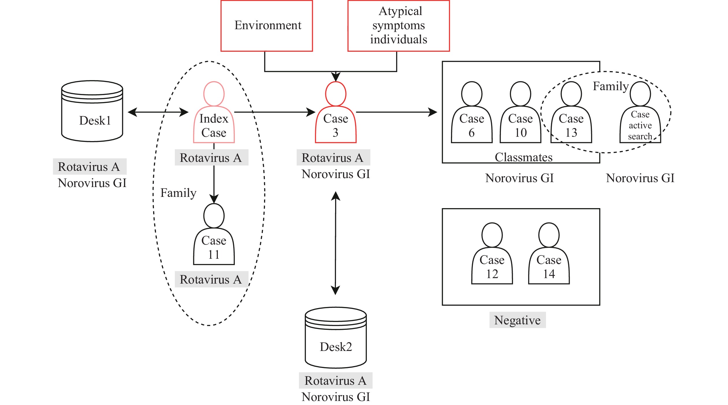 Results: The outbreak affected 14 cases in 1 class, yielding a 38.9% attack rate with mild symptoms. Among 8 anal swab samples, 3 cases tested positive for norovirus GI, 2 cases (including the index case) tested positive for rotavirus A, and 1 case tested positive for both norovirus GI and rotavirus A. Among 8 environmental samples, 4 samples tested positive for both norovirus GI and rotavirus A, 1 sample tested positive for norovirus GI only, and 3 samples tested positive for rotavirus A only. The outbreak was initiated by the index case vomiting in the classroom; individuals with atypical symptoms and environmental contamination subsequently contributed to the co-infection transmission. Case numbers peaked within 3 days before the outbreak was successfully controlled. Notably, family-based active case searching identified 1 asymptomatic carrier of norovirus GI. Dining facilities and water hygiene were confirmed safe, ruling out foodborne or waterborne transmission.