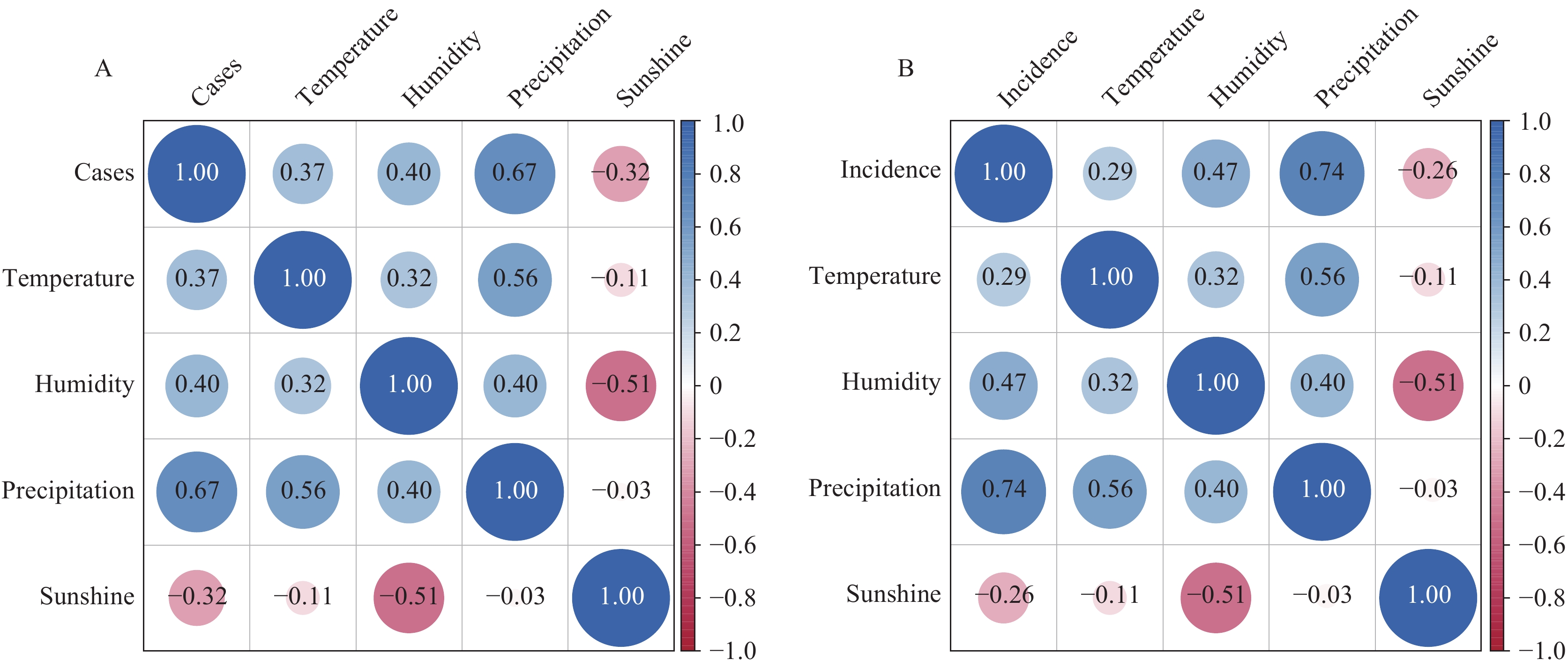FIGURE 2.  Correlation coefficients between (A) dengue fever cases, or (B) incidence rates, and meteorological factors.