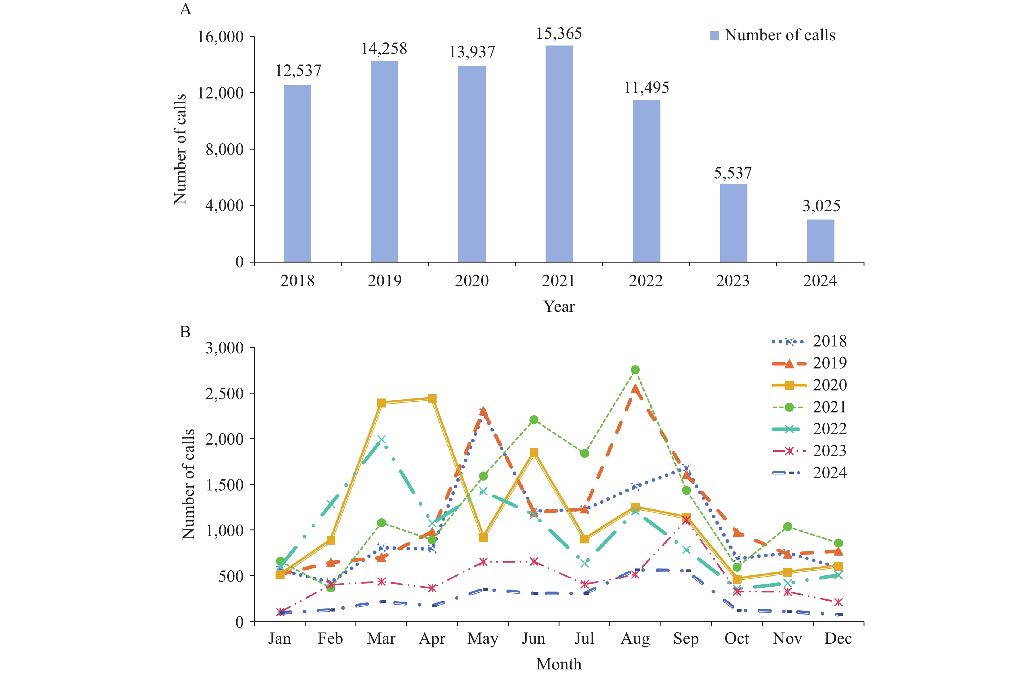 • FIGURE 1.  Hotline call volumes in Suzhou from 2018 to 2024. (A) Annual call counts; (B) Monthly call counts.