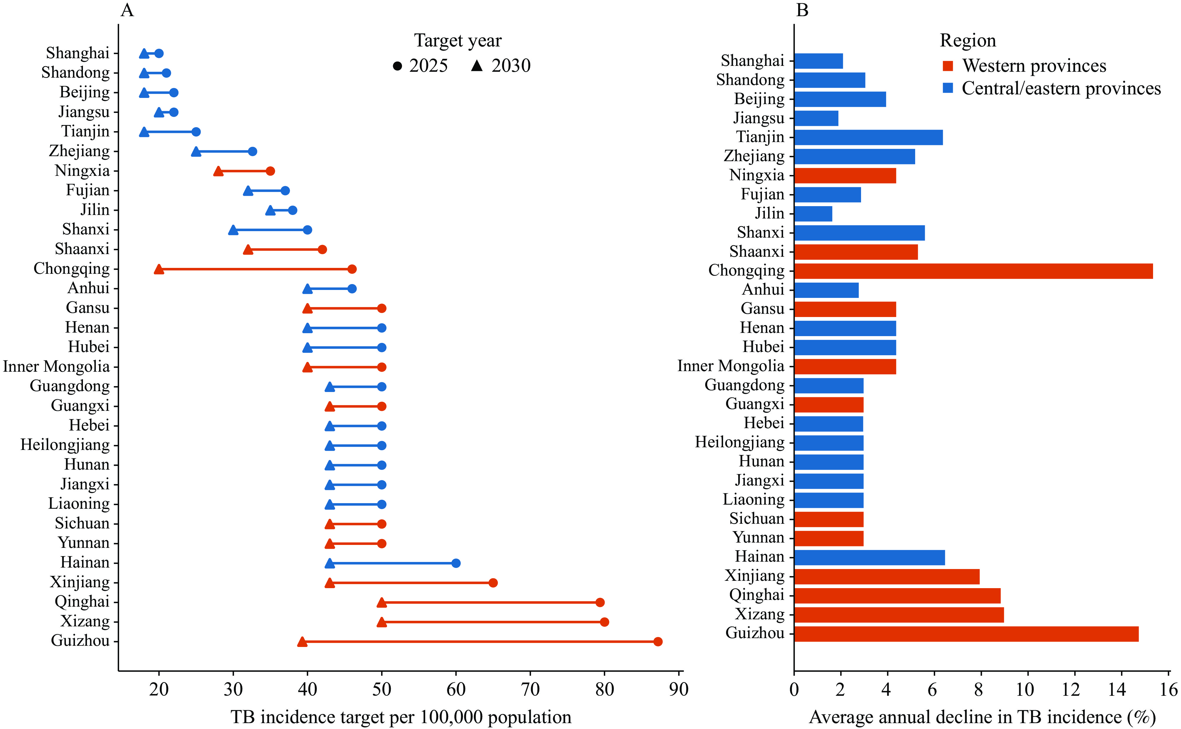 Figure 1.Provincial TB incidence targets and projected annual declines across provinces in China. (A) Provincial TB incidence targets for 2025 to 2030. (B) Provincial average annual decline in TB incidence from 2025 to 2030 across provinces, shown using the same regional classification.