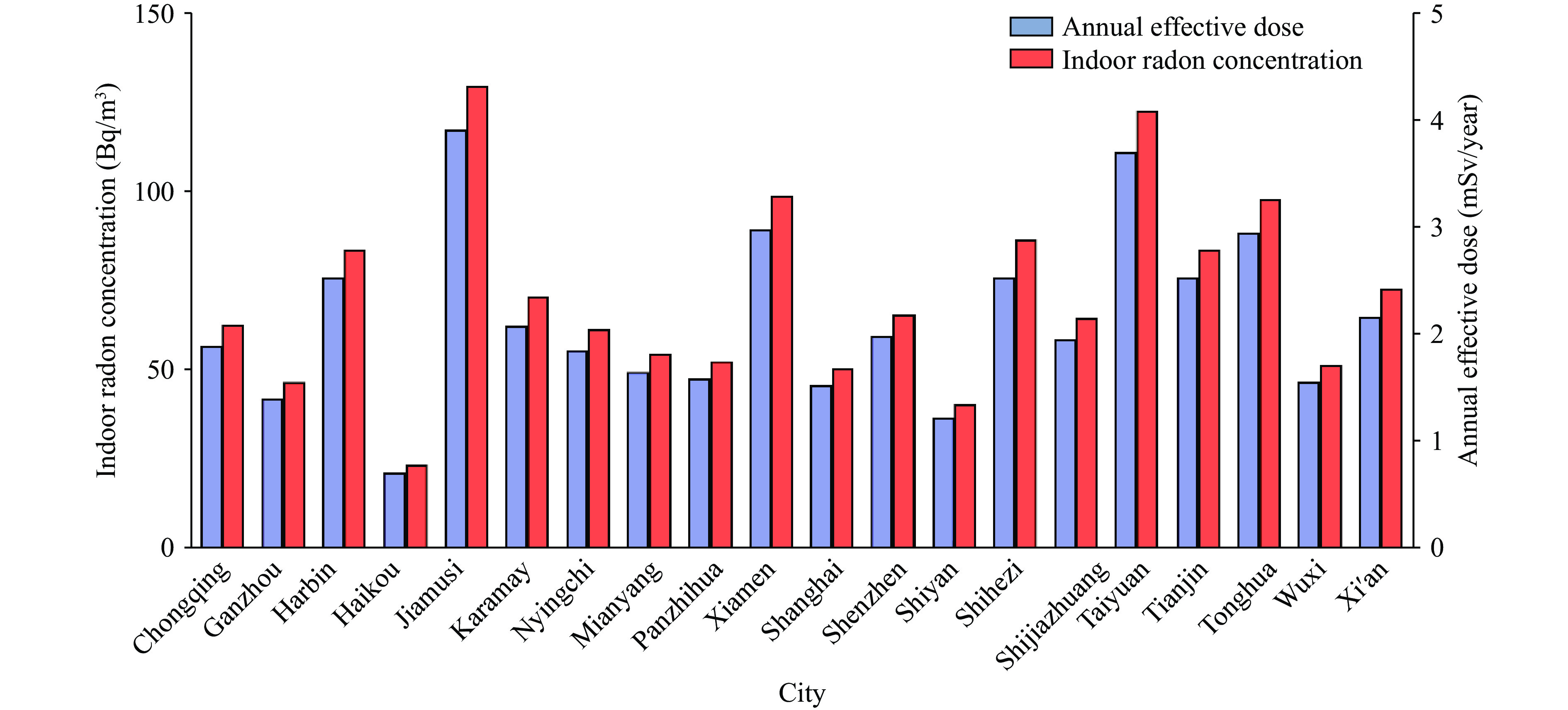 Figure 1.Median indoor radon concentrations (Bq/m3) and annual effective doses (mSv/year) for residents across 20 cities in China.