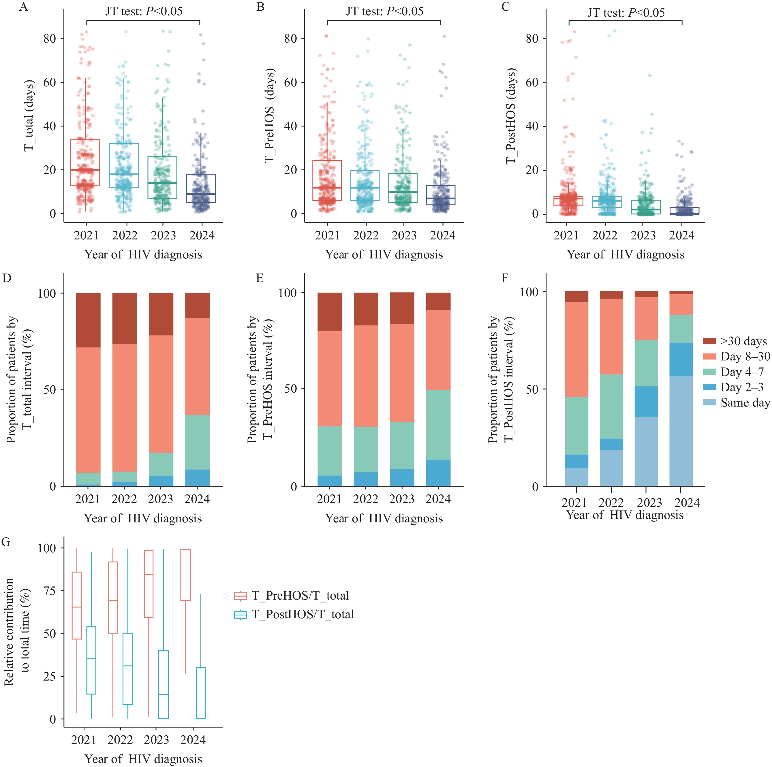 • FIGURE 1.  Time intervals from HIV diagnosis to ART initiation: annual trends and distributions among adults in nanjing, 2021–2024. (A–C) Boxplots of T_total, T_PreHOS, and T_PostHOS by diagnosis year. (D–F) Proportions of patients in each interval category for T_total, T_PreHOS, and T_PostHOS. (G) Relative contributions of T_PreHOS and T_PostHOS to T_total.