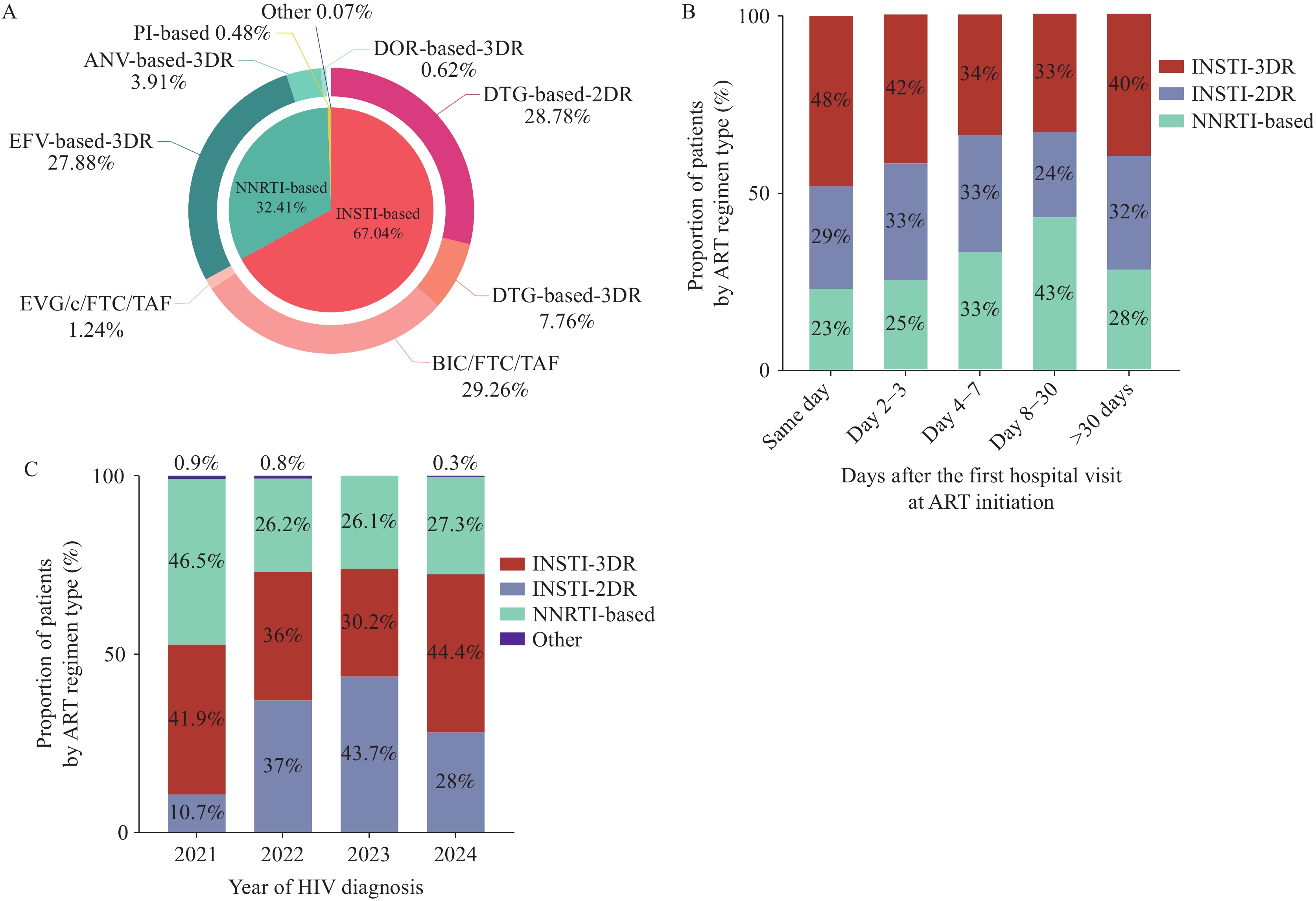 FIGURE 2.  Distribution and temporal patterns of initial ART regimens. (A) Overall distribution of initial ART regimens. (B) Distribution of initial ART regimens by time from first hospital visit to ART initiation. (C) Distribution of initial ART regimens by year of HIV diagnosis.