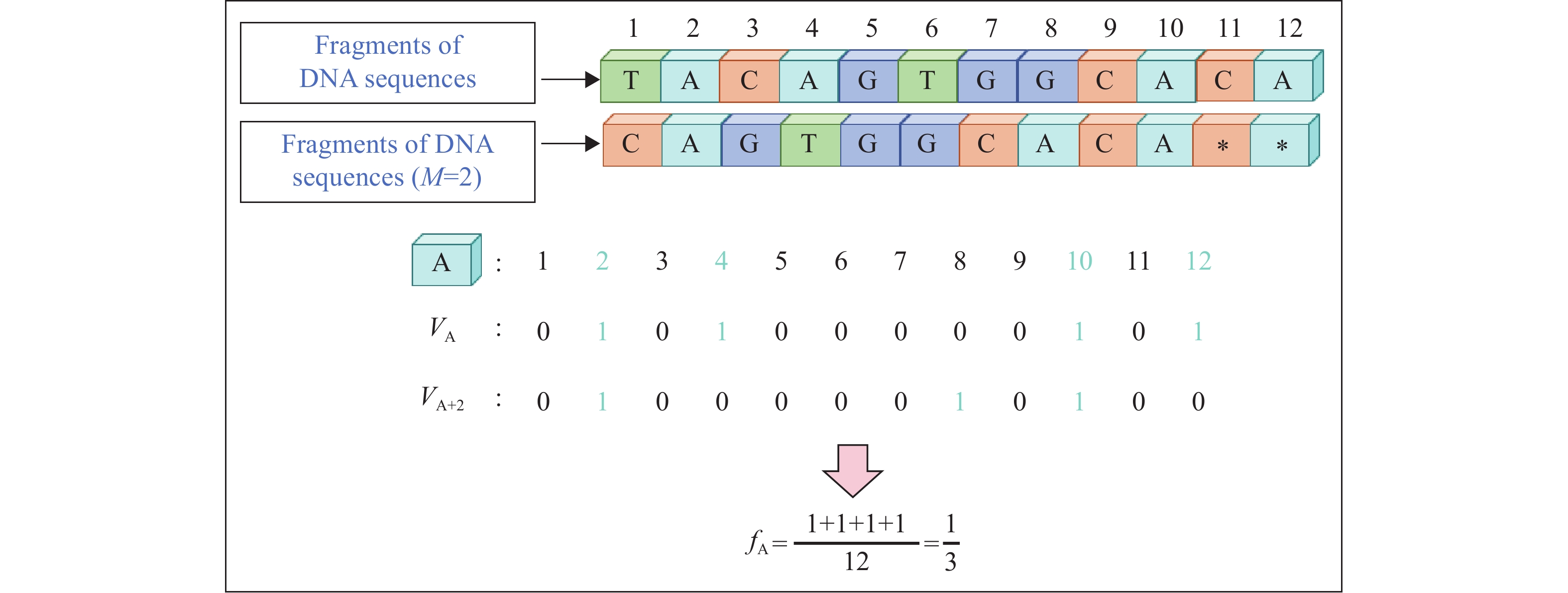 $$ \begin{aligned} & {\text{V}}_{\text{A}}=[1,0,0,0,1,1,0] \\ & ({\mathrm{A\; appears\; in\; the\; 1st, \;5th, \;and\; 6th \;positions}}.) \end{aligned}$$ (2)