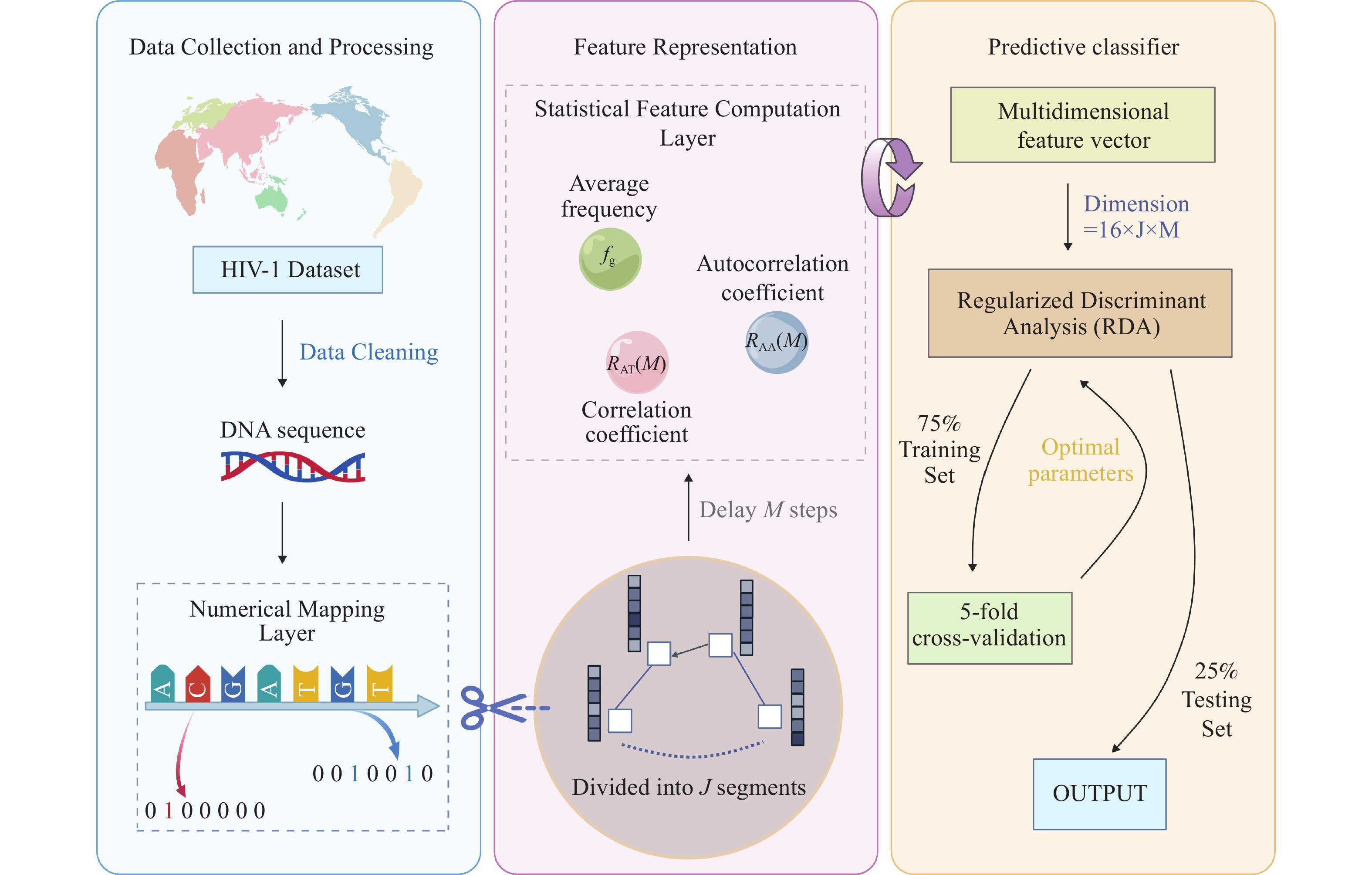 Figure 2 illustrates the overall framework of the SCCFV method. First, the input sequence is converted into a four-dimensional vector representation via a numerical mapping layer to capture base position information. Subsequently, the sequence is uniformly partitioned into J subsegments, and both local and global features are extracted via a statistical feature computation layer to construct a multidimensional feature vector. After input to the RDA classifier optimized via 5-fold cross-validation, the optimal model is obtained by parameter tuning, ultimately achieving precise HIV-1 subtype classification.
