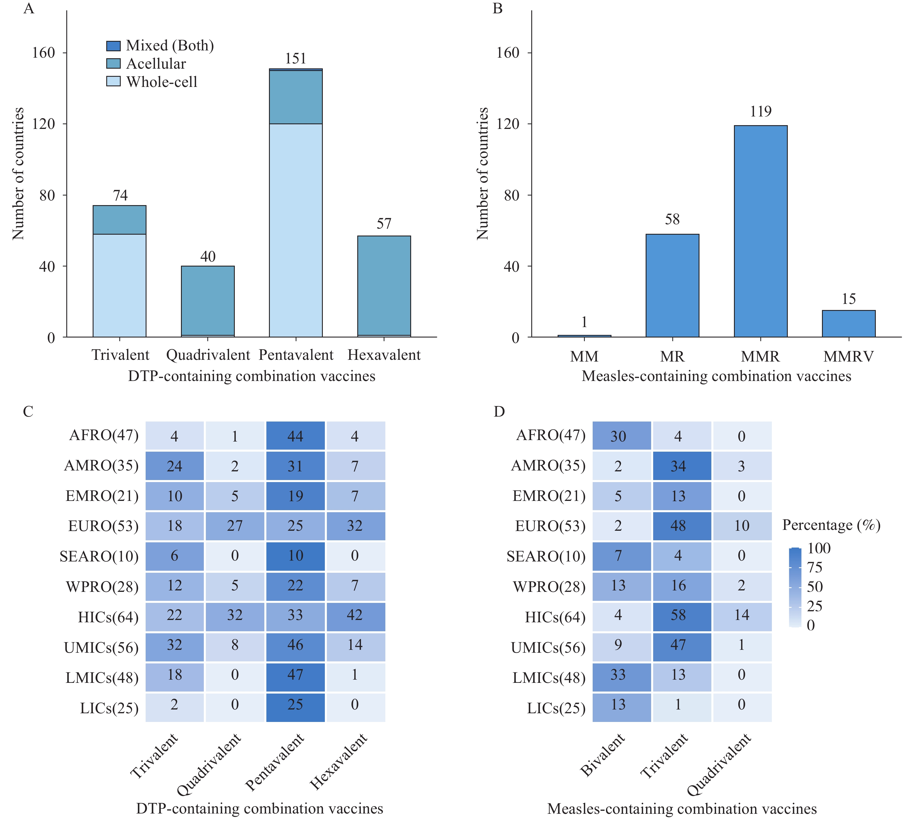 Figure 1.Number of countries using different combination vaccines in routine childhood immunization, 2024. (A) Number of countries using various DTP-containing vaccines; (B) Number of countries using various measles-containing vaccines; (C) Distribution of DTP-containing vaccines by WHO region and income level; (D) Distribution of measles-containing vaccines by WHO region and income level.