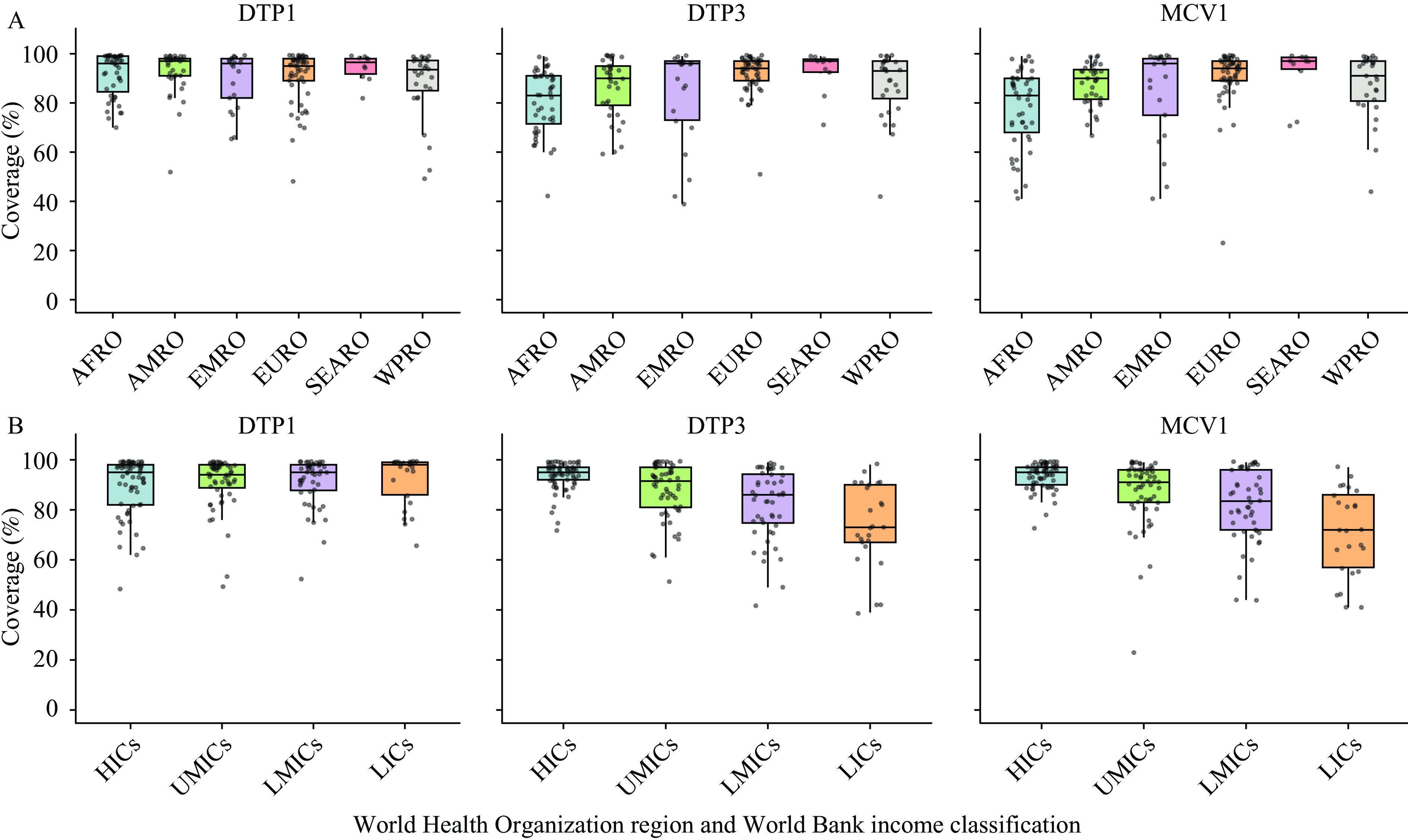 Figure 2.Vaccination coverage of DTP1, DTP3, and MCV1 by WHO region and income level in 2024. (A) Distribution of DTP1, DTP3, and MCV1 coverage across WHO regions; (B) Distribution of DTP1, DTP3, and MCV1 coverage across income levels.