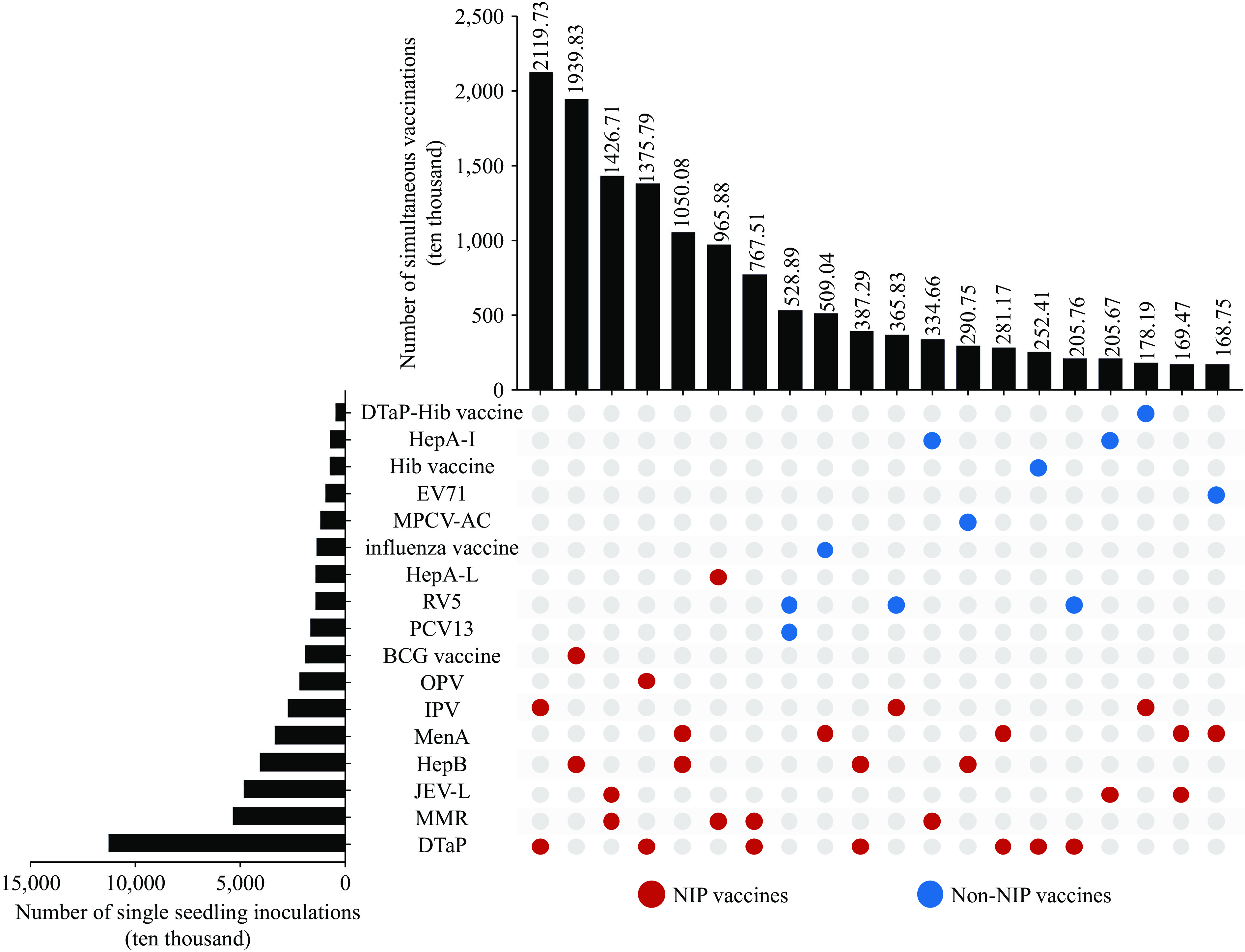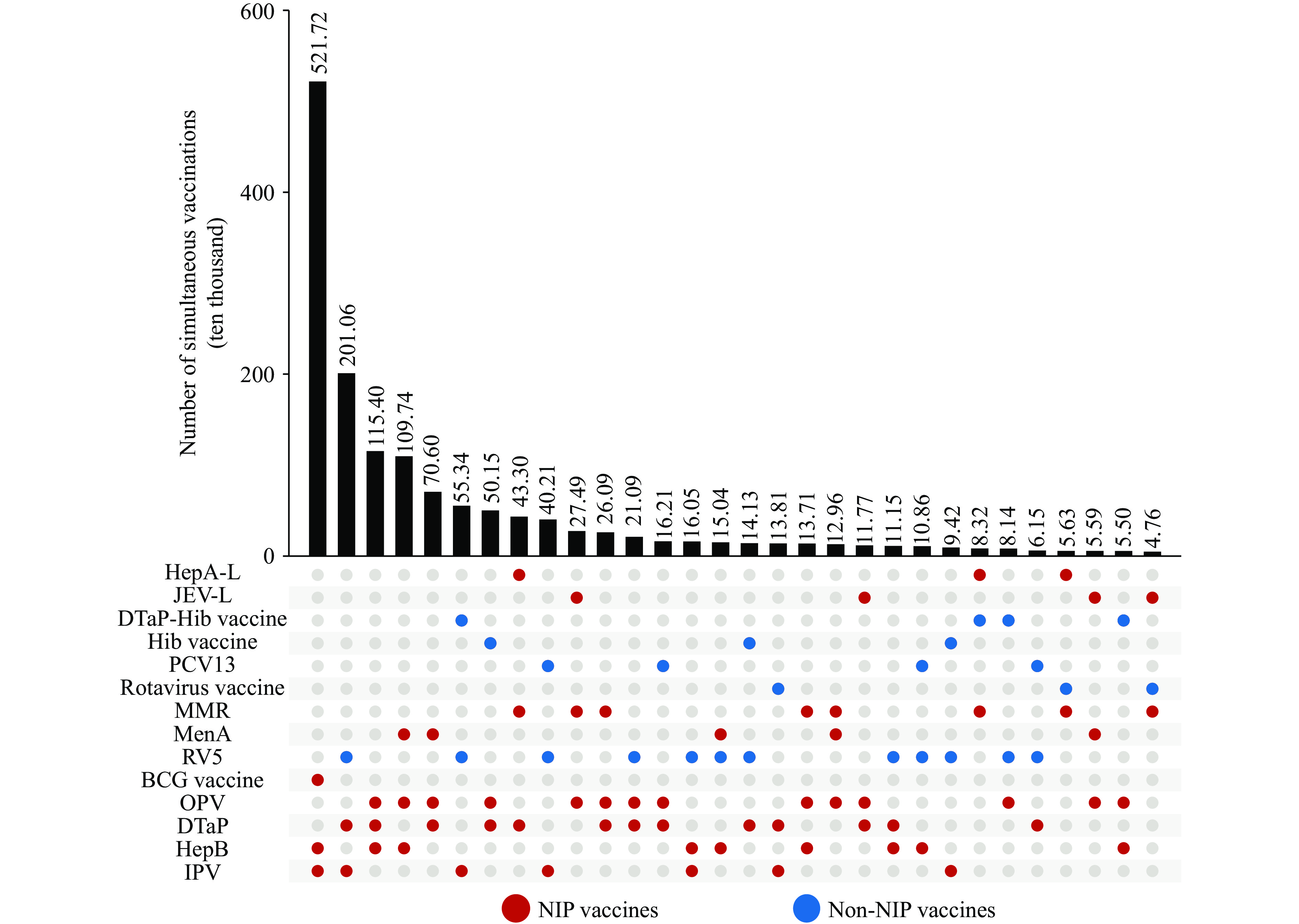 Results: A total of 748.30 million vaccine doses were administered. Among these, 46.27% were given as two-vaccine simultaneous combinations, 2.36% as three-vaccine combinations, and 0.003% as four or more vaccines. Two-vaccine combinations mainly involved only National Immunization Program (NIP) vaccines (74%–78%), whereas three- and four-vaccine combinations more often included both NIP and non-NIP vaccines. Common combinations included diphtheria, tetanus, and acellular pertussis (DTaP) with inactivated poliovirus vaccine (IPV), HepB, or BCG.