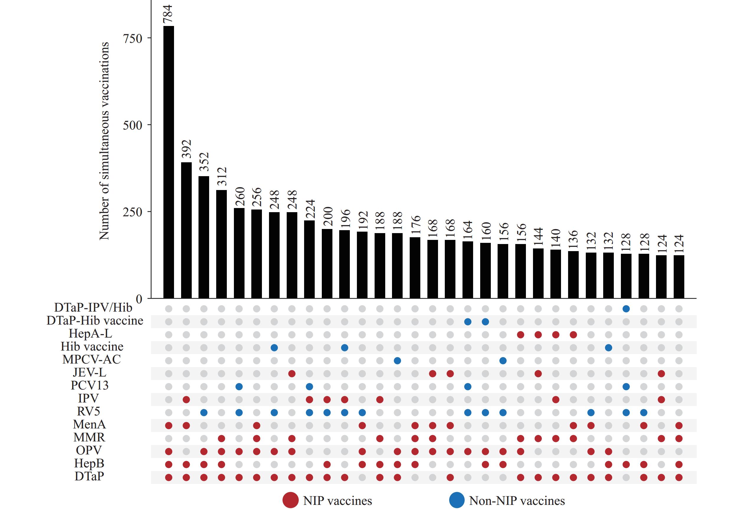 As the number of vaccines increased, combinations consisting only of non-NIP vaccines were uncommon, whereas those including NIP vaccines were more frequent. This pattern may reflect the self-paid nature and accessibility of non-NIP vaccines, as well as financial considerations. In addition, technical guidance on simultaneous administration of some non-NIP vaccines remains limited (2), which may encourage cautious implementation by clinics. Consequently, non-NIP vaccines are often administered alongside NIP vaccines rather than concentrated in a single visit.